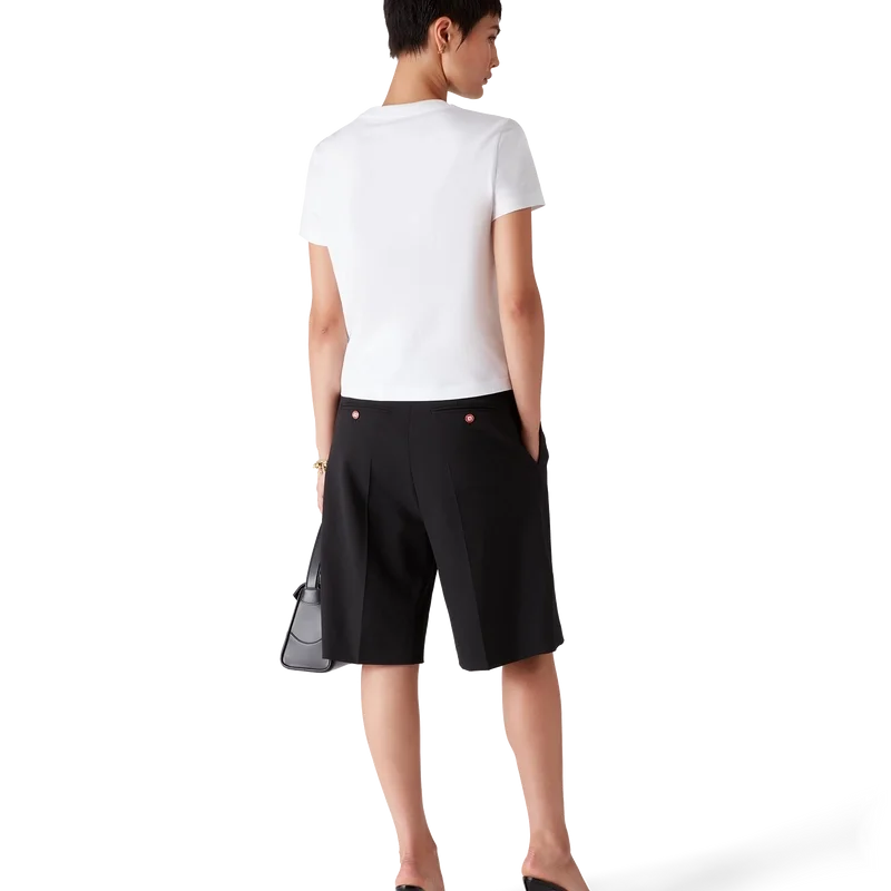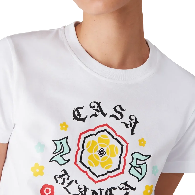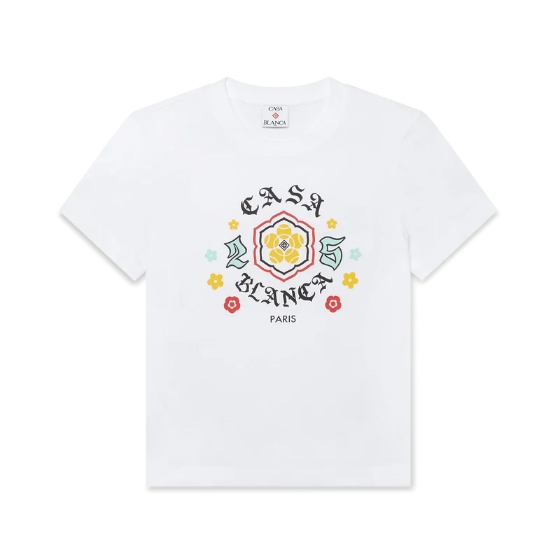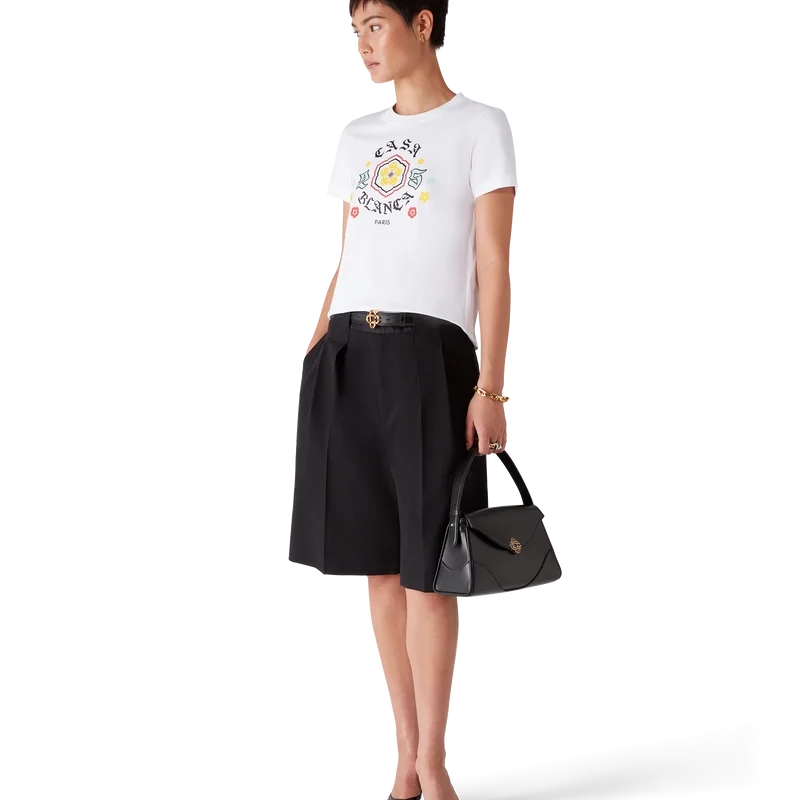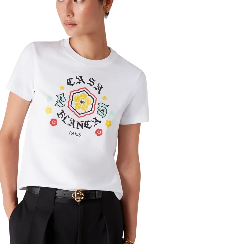 La camiseta ajustada con emblema es un diseño de manga corta que presenta el diseño gráfico de esta temporada, en el que nos hemos inspirado en la subcultura japonesa del BōSōZoku como uno de nuestros temas principales. El contraste entre los elementos gráficos y el texto nos recordó mucho a Casablanca. Hemos creado nuestra propia interpretación del arte BōSōZoku, incorporando frases que describen la marca, como «Contemplando la belleza del mundo». El diseño es poco convencional, pero la composición está cuidadosamente equilibrada, lo que le da un aire único y a la vez armonioso. Rematada con un clásico cuello redondo.