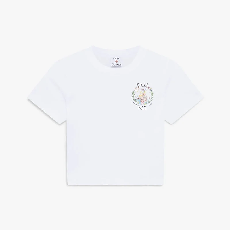 La camiseta de manga corta para bebé «White Casa Way» presenta un diseño corto y luce el estampado «Casa Way» de esta temporada, que describe la visión utópica de Ibiza como destino de una peregrinación casi religiosa de descubrimiento a través de su variado panorama musical. Se completa con un clásico cuello redondo y una silueta entallada.