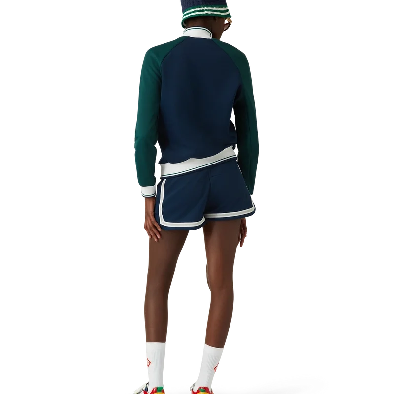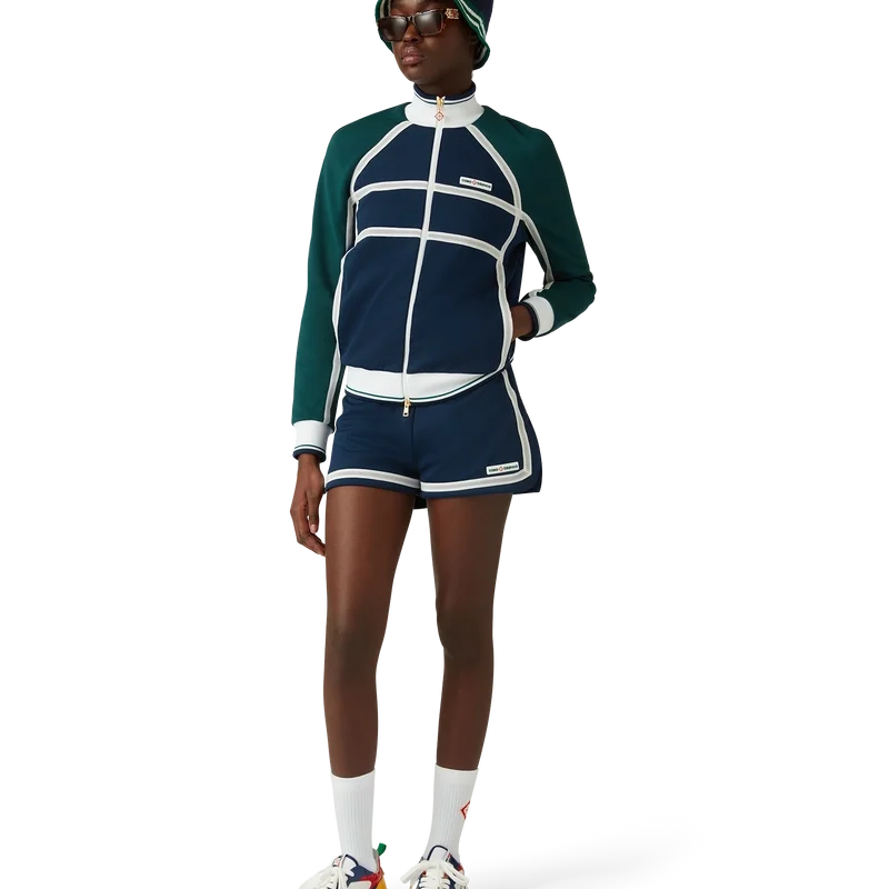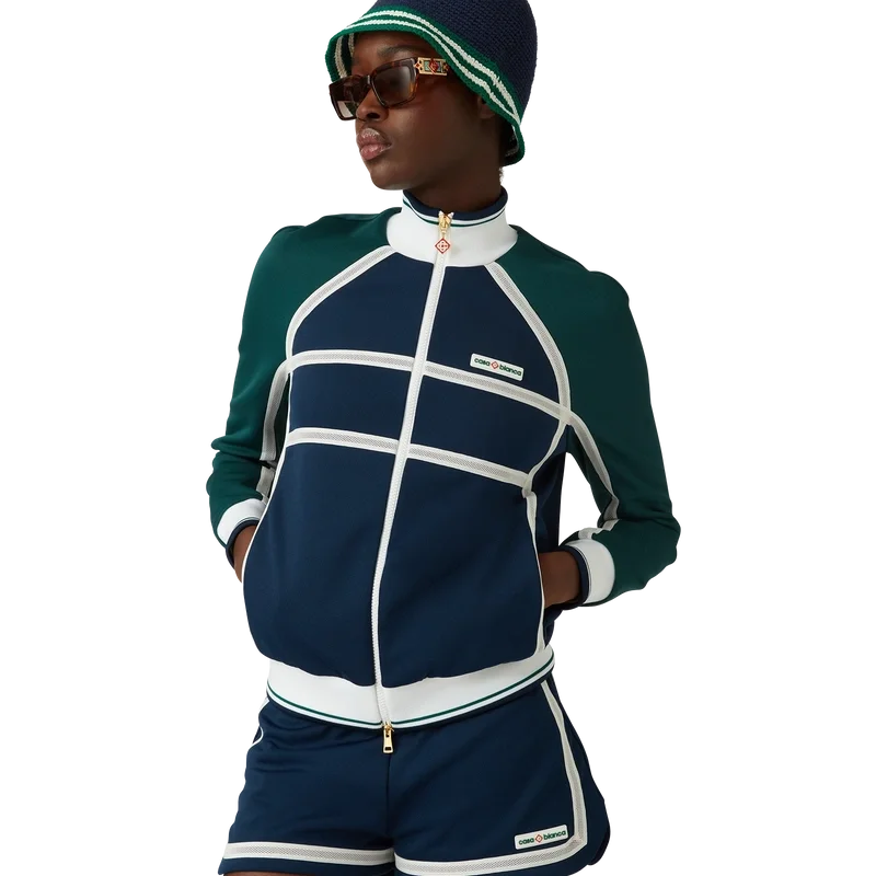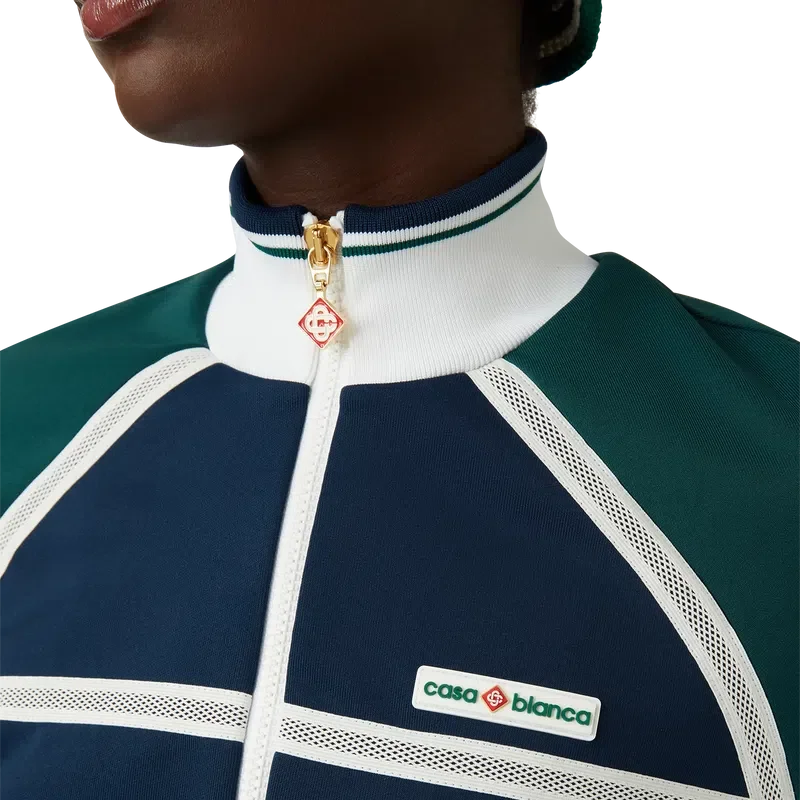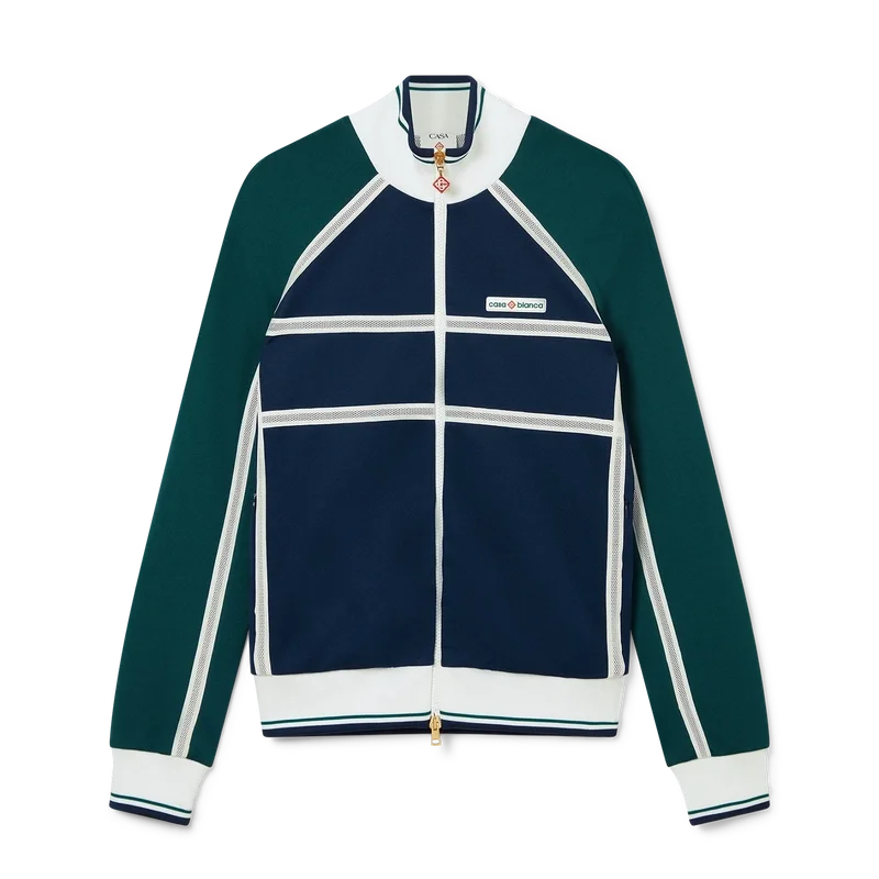 La chaqueta deportiva con cinta de malla es un diseño inspirado en la ropa deportiva confeccionado en tejido de tricot. Cuenta con cierre de cremallera, paneles con ribetes blancos, cuello, puños y bajo acanalados con detalles de rayas, bolsillos laterales, detalle de cinta de malla y el logotipo Casablanca característico de la marca.