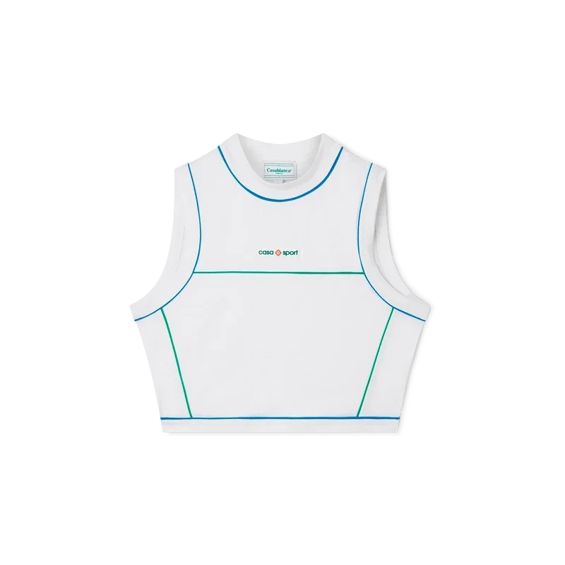 El chaleco de cuello alto Casa Sport es una prenda deportiva sin mangas confeccionada en tejido de mezcla de poliéster y elastano, con el logotipo de Casa Sport en el pecho. Se completa con un cuello alto y ribetes en contraste alrededor del cuello, el pecho, las sisas y la cintura.