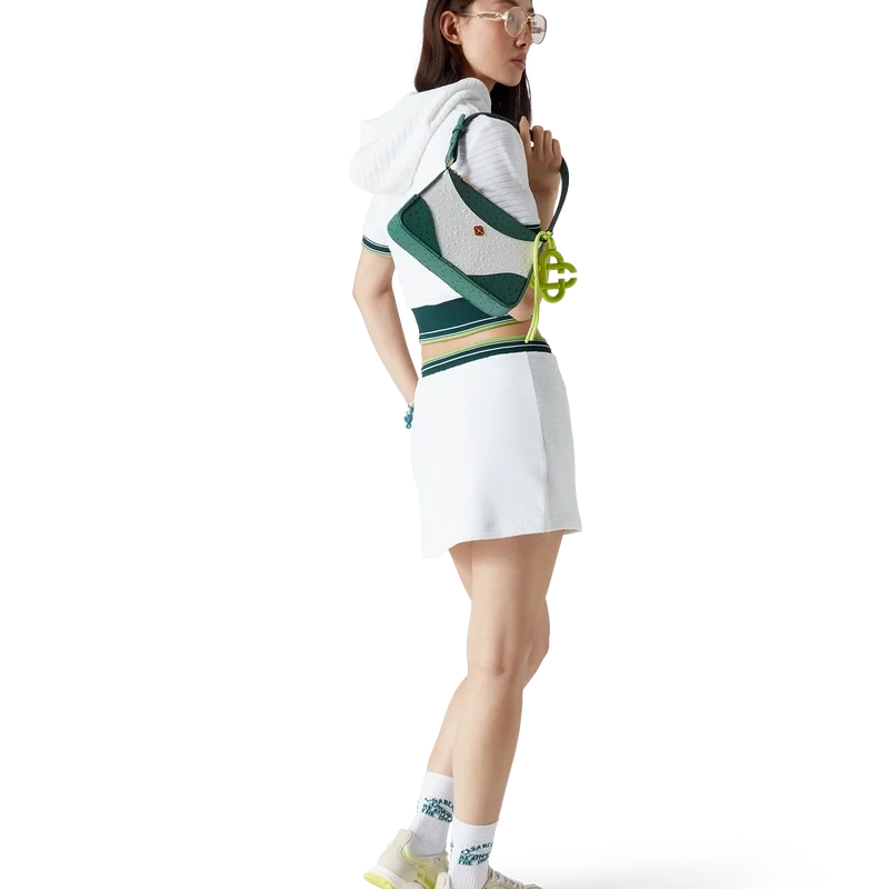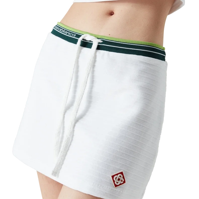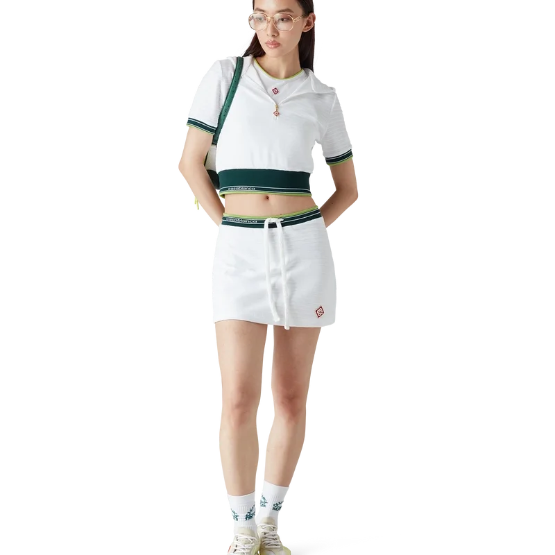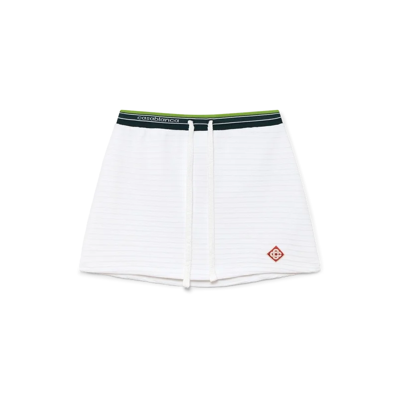 La falda de tenis de terciopelo texturizado es un diseño mini de corte acampanado confeccionado en tejido de terciopelo. Se completa con una cintura elástica a rayas con el logotipo de Casablanca, cierre con cordón y el logotipo del diamante característico de la casa en el dobladillo.