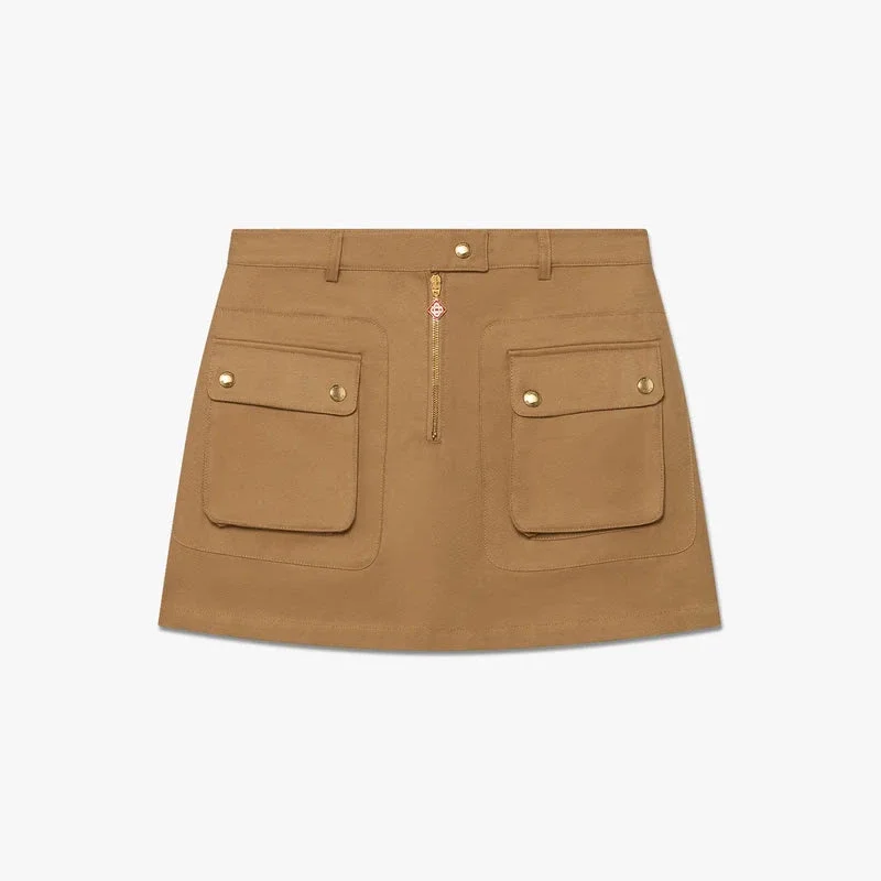 La minifalda de algodón con bolsillos en color beige presenta un refinado diseño en línea A confeccionado en resistente tejido de sarga de algodón en un cálido tono beige. Cuenta con cinturilla, presillas para cinturón, cierre de cremallera, herrajes chapados en oro, bolsillos de parche funcionales y una silueta estructurada.