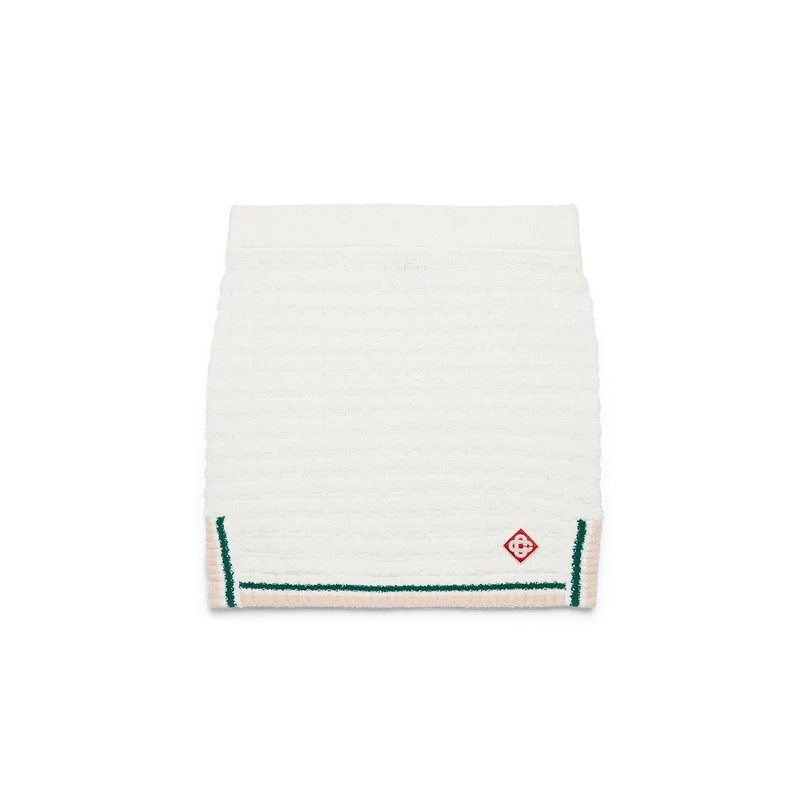 La minifalda de bouclé de algodón es un diseño de punto confeccionado en tejido de bouclé de algodón con el emblemático logotipo de rombos de la casa. Se completa con una cintura elástica, un dobladillo acanalado y aberturas laterales con detalles de rayas en rosa, blanco y verde.