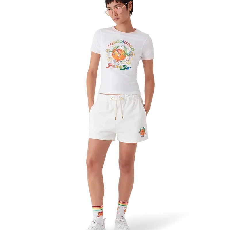 Los pantalones cortos de chándal acolchados con la mascota de tenis presentan un diseño bordado, confeccionados con un tejido acolchado con patrón de cuadrícula que incluye ilustraciones de temporada de la pelota de tenis kawaii. Este personaje es una parte fundamental de nuestro universo. Incorpora elementos como la hoja de laurel, las zapatillas Atlantis, la raqueta y los ojos kawaii. Hemos elegido a este personaje como motivo central de todos los modelos para hombre de la colección. Se completan con cintura elástica, cierre con cordón, bolsillos en las costuras y un bolsillo trasero de parche Anda.