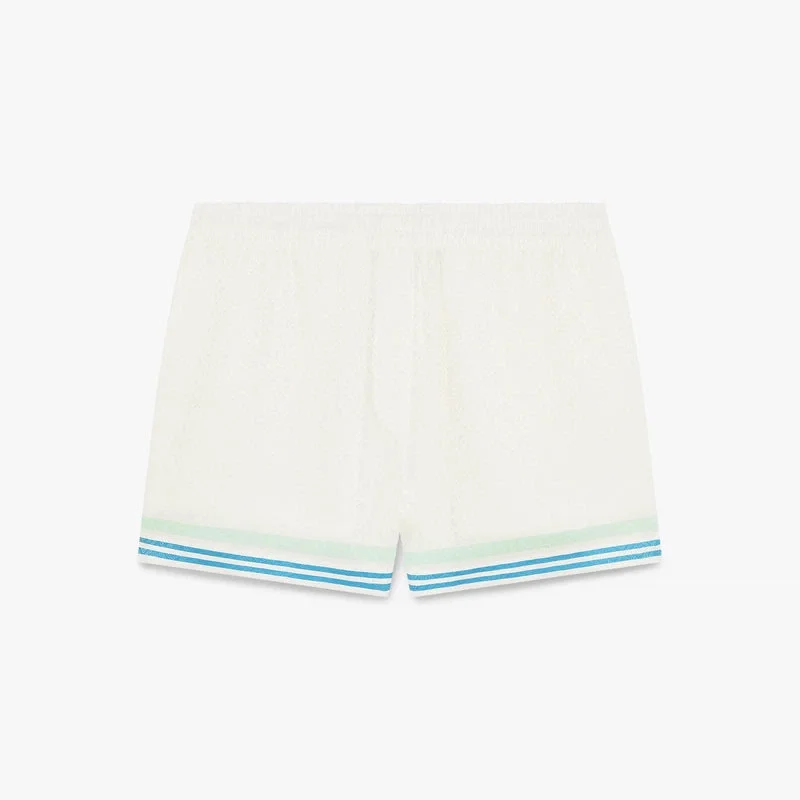 Los pantalones cortos de seda jacquard con monograma floral Cc Smile presentan un diseño estampado con el collage gráfico de la temporada, que incluye interpretaciones del logotipo, una cara sonriente y una flor de orquídea. Cuentan con cintura elástica, cierre con cordón, bolsillos laterales en las costuras, un bolsillo trasero y detalles de rayas verdes, azules y blancas en el dobladillo y los bordes de los bolsillos, además de una silueta holgada.