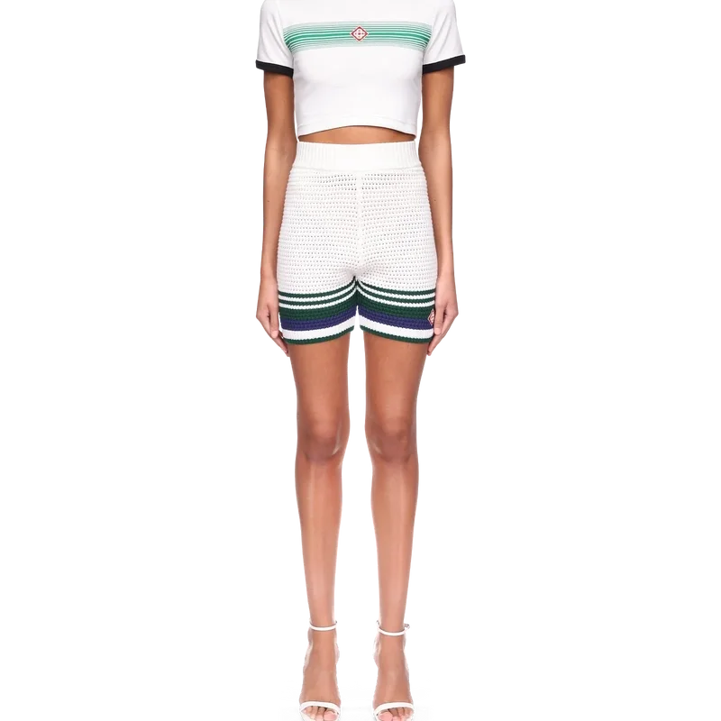 Los pantalones cortos de tenis de ganchillo para mujer presentan un diseño de textura suave confeccionado en tejido de algodón de punto, con el emblemático logotipo de diamantes entrelazados de la casa. Acabados con un detalle de rayas en contraste en el dobladillo y una cintura elástica.