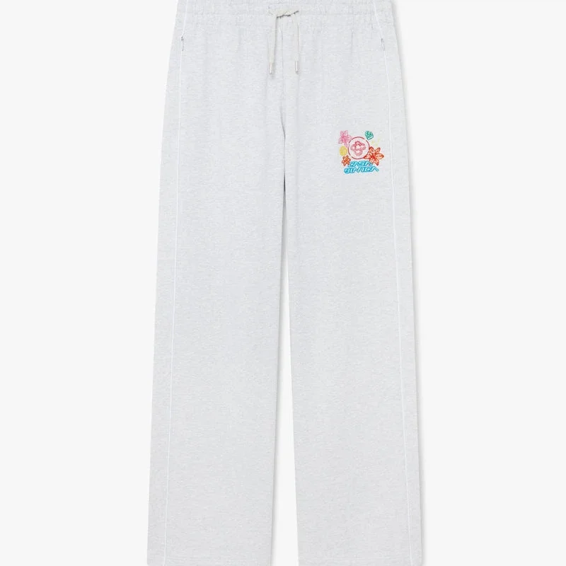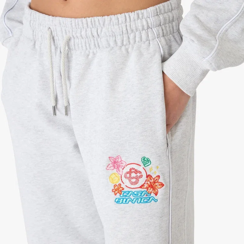 Los pantalones cortos de chándal grises bordados presentan un diseño refinado, con el collage gráfico de la temporada que representa la iconografía y los elementos de diseño de la nueva temporada, con interpretaciones del logotipo, la cara sonriente y la flor de orquídea. Se completan con una cintura elástica, cierre con cordón, ribetes a los lados, bolsillos en las costuras y un bolsillo de parche en la parte trasera. Diseñados para llevarse con la sudadera con capucha a juego.