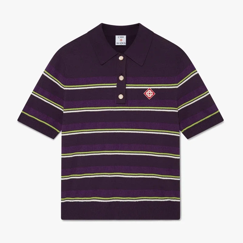 La camisa ajustada a rayas moradas y verdes presenta un diseño de punto refinado con el emblemático logotipo de diamante de la casa. Se completa con cierre de botones, botones de perla con borde dorado característicos, puños, bajo, cuello y tapeta acanalados, una silueta entallada y detalles de rayas que encarnan los códigos de estilo informal de la casa.