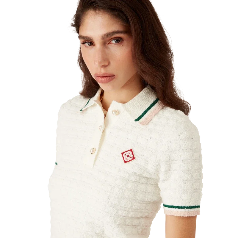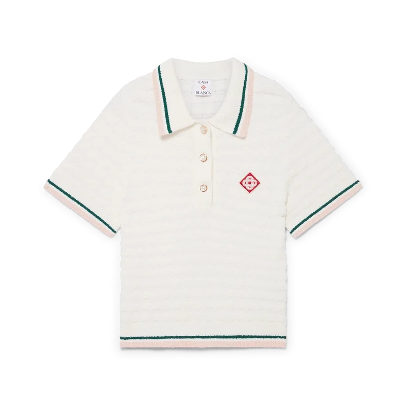 El polo de bouclé de algodón está confeccionado en tejido de bouclé de algodón y luce el emblemático logotipo de rombos de la casa. Se completa con los característicos botones de perla con ribete dorado, cuello acanalado, puños y bajo con detalles de rayas en rosa, blanco y verde.