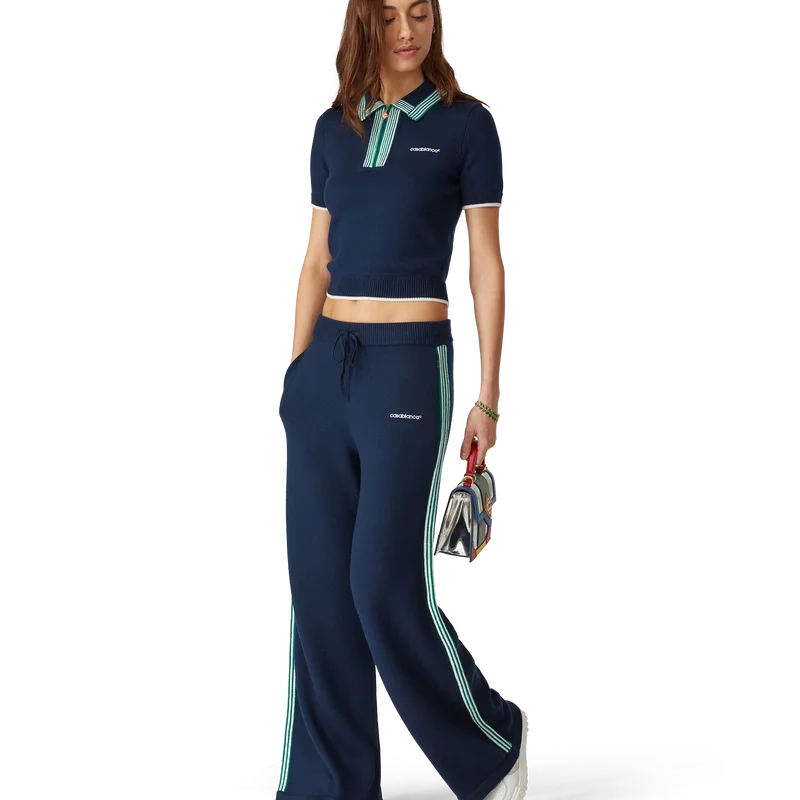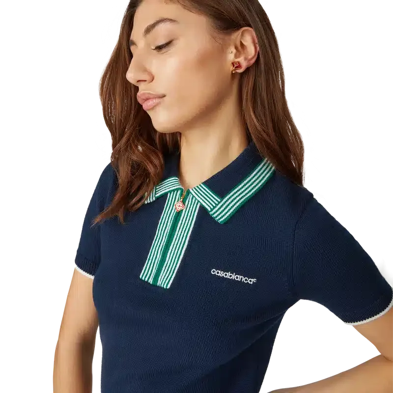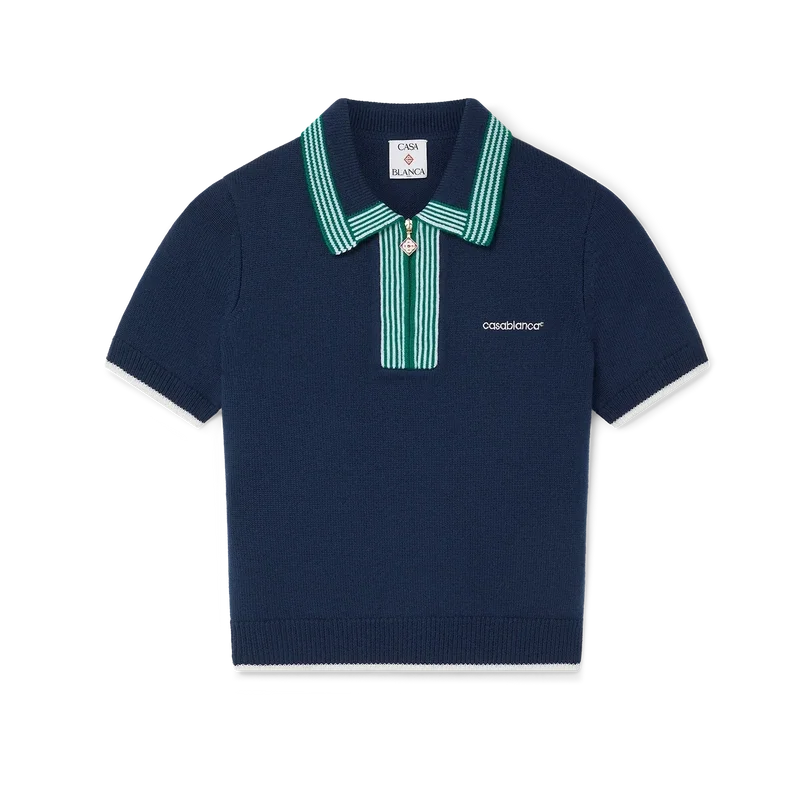 La camiseta de tenis de punto es un diseño clásico confeccionado en tejido de lana merino. Se completa con detalles de ribete en contraste en los puños, el dobladillo, el cuello y la tapeta, cierre frontal con cremallera, cuello acanalado y logotipo de Casablanca.