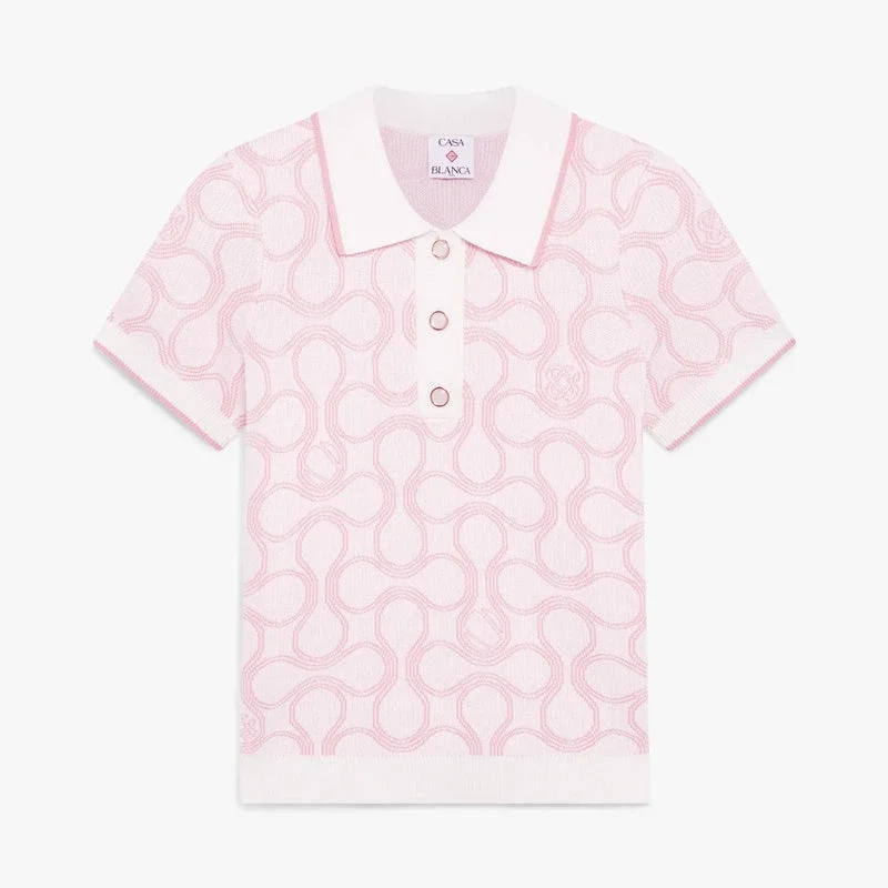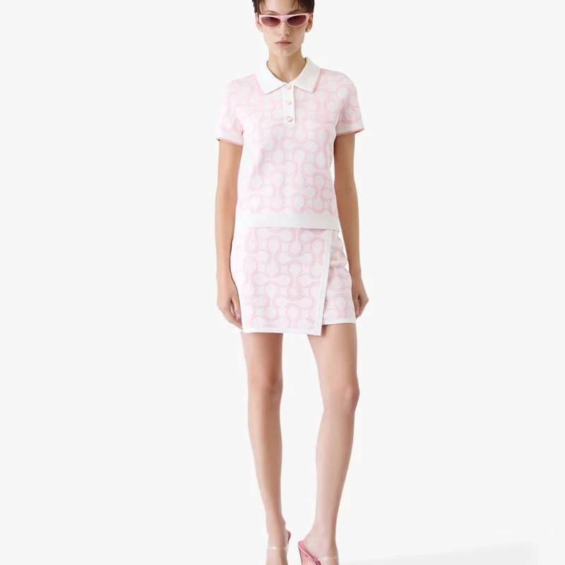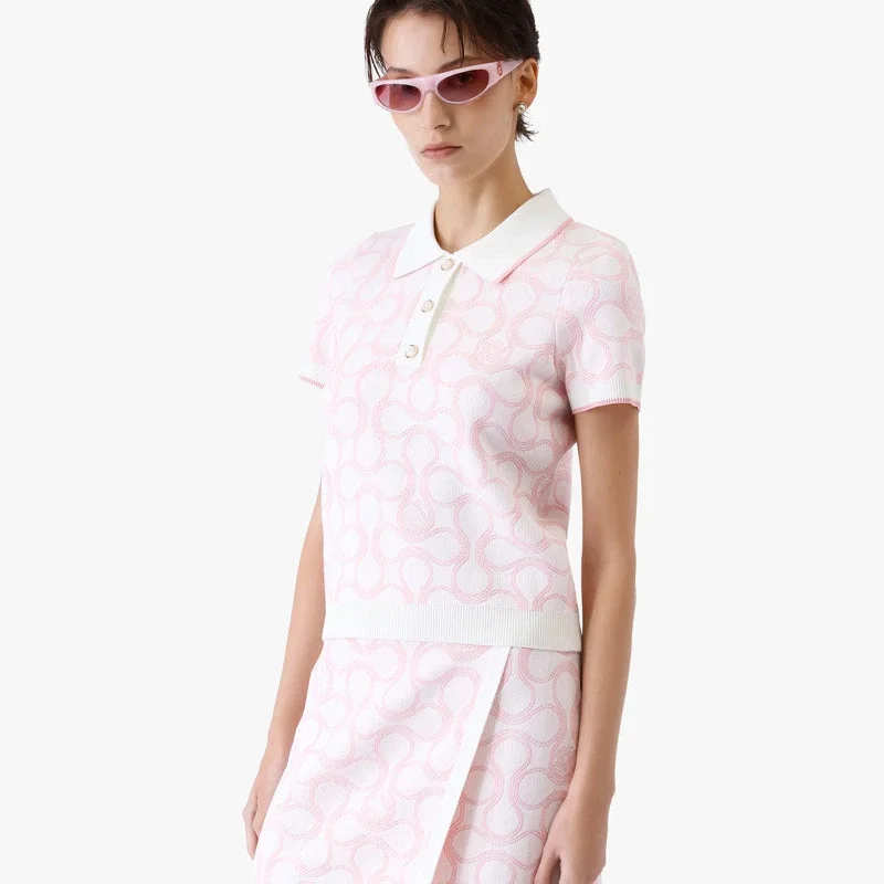 El polo Optic Drop es un diseño de punto refinado, que presenta el estampado de la temporada en la gama de colores Bourgeois de la casa. Se completa con un clásico cuello acanalado, tapeta, puños y bajo con detalles de ribete en contraste, cierre de botones, botones de perla con borde dorado característicos y pantalones cortos en una silueta entallada. Diseñado para llevarse con la minifalda cruzada a juego.