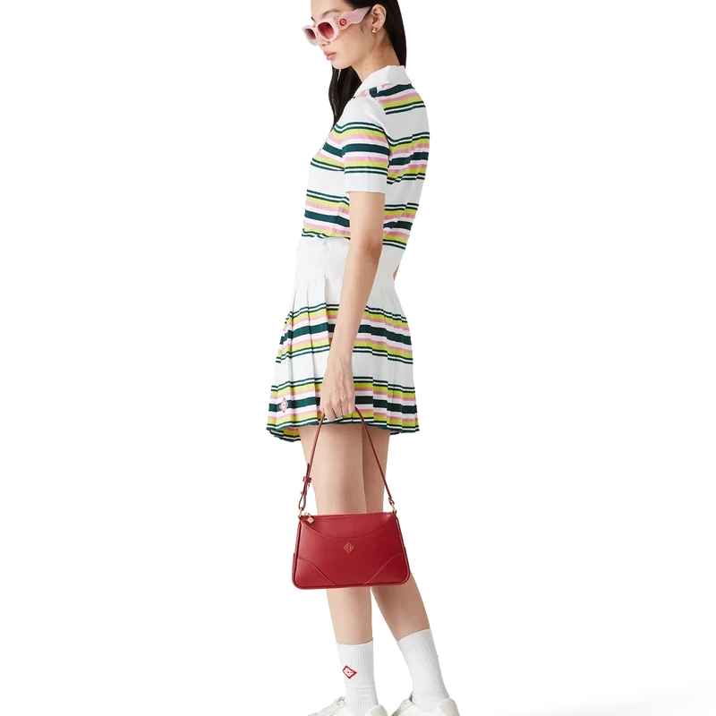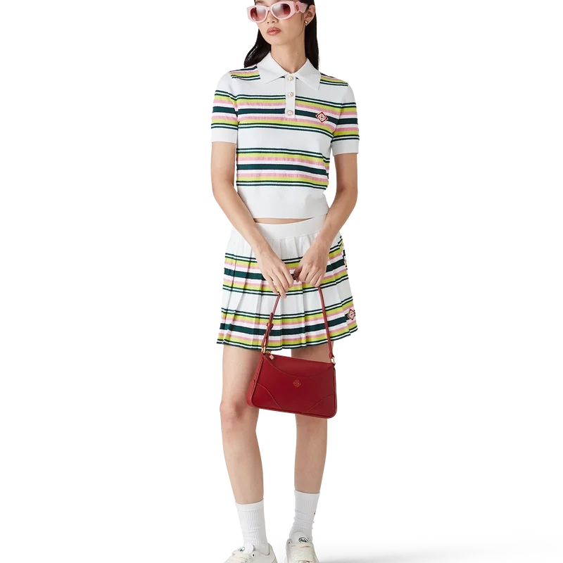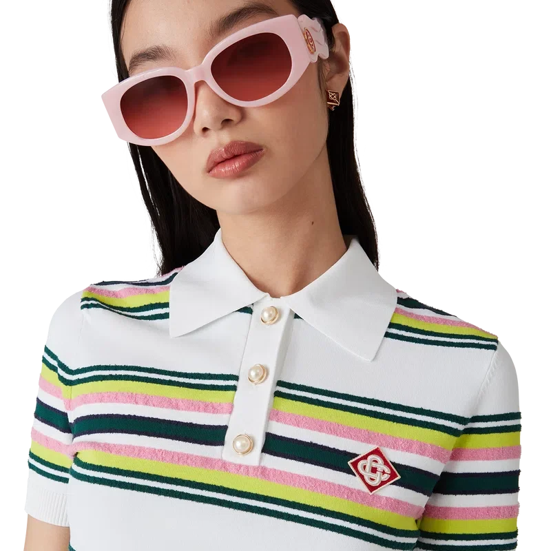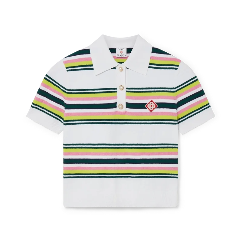 El polo a rayas es un diseño de manga corta confeccionado en tejido de punto a rayas con el emblemático logotipo de diamante de la casa. Se completa con botones de perla con borde dorado característicos, tapeta de tres botones y puños, dobladillo, cuello y tapeta acanalados.