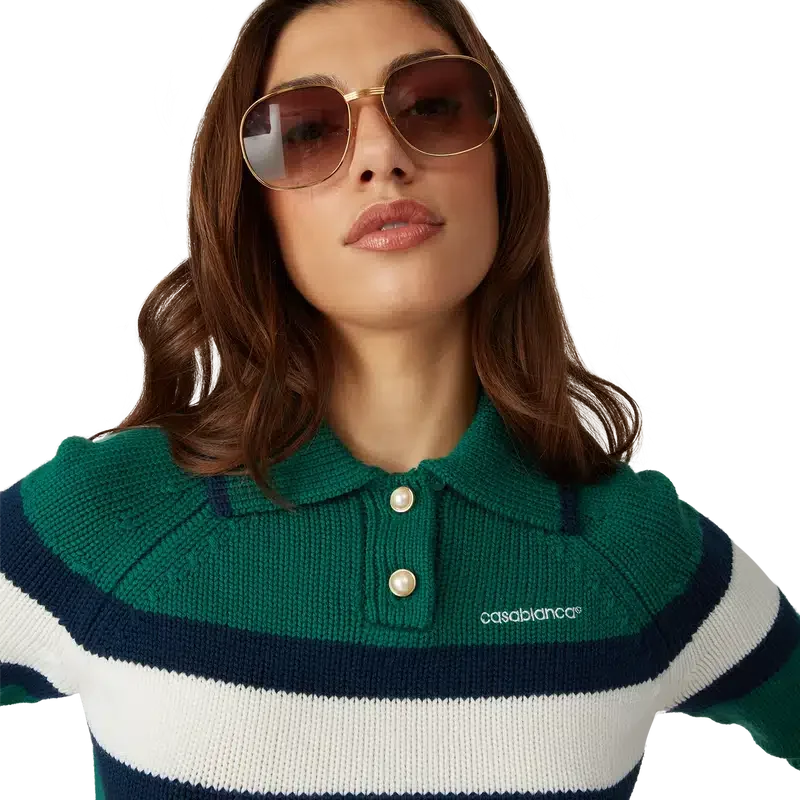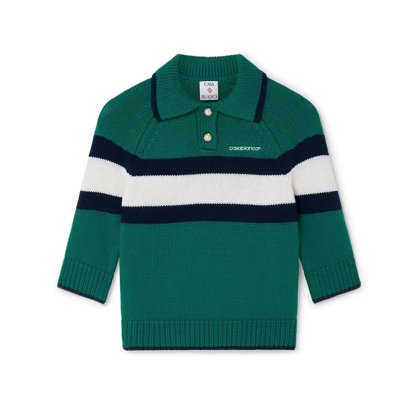 El polo con bloques de color es un diseño corto de manga larga confeccionado en tejido de lana merina y presenta una raya azul y blanca que recorre el pecho y la espalda. Se completa con mangas raglán, puños, dobladillo y cuello acanalados, botones de perla con borde dorado característicos y el logotipo de Casablanca.