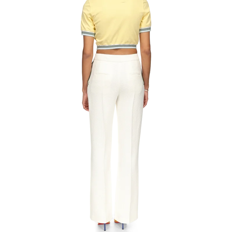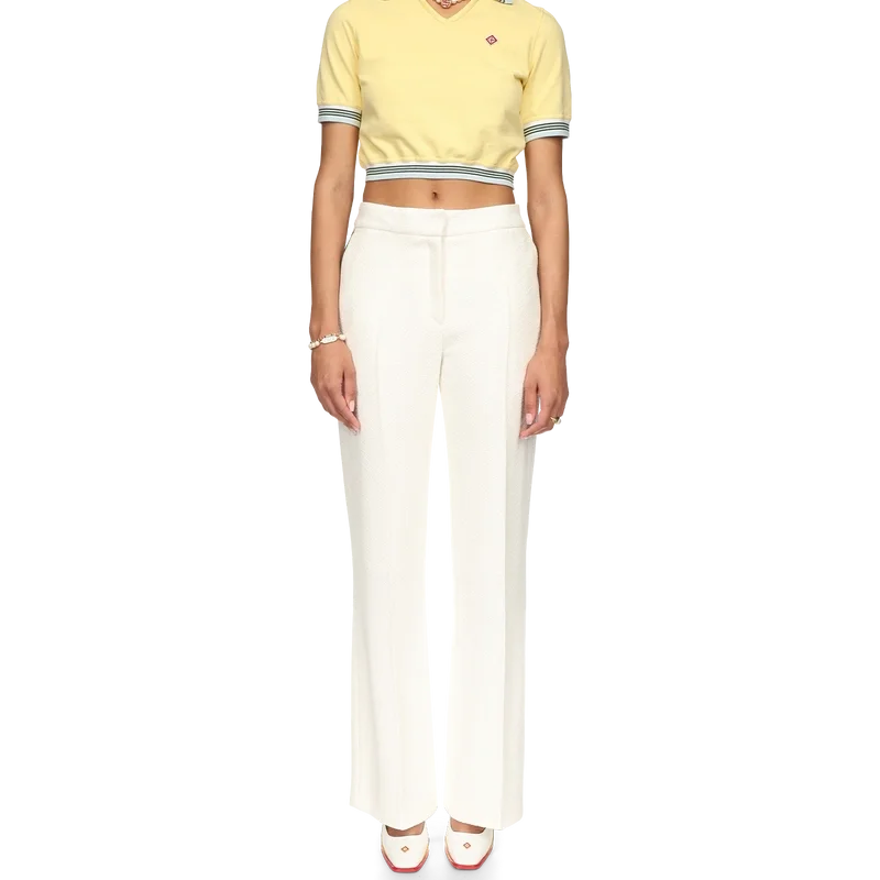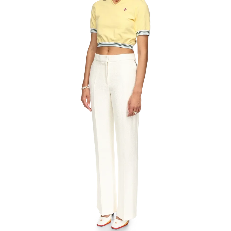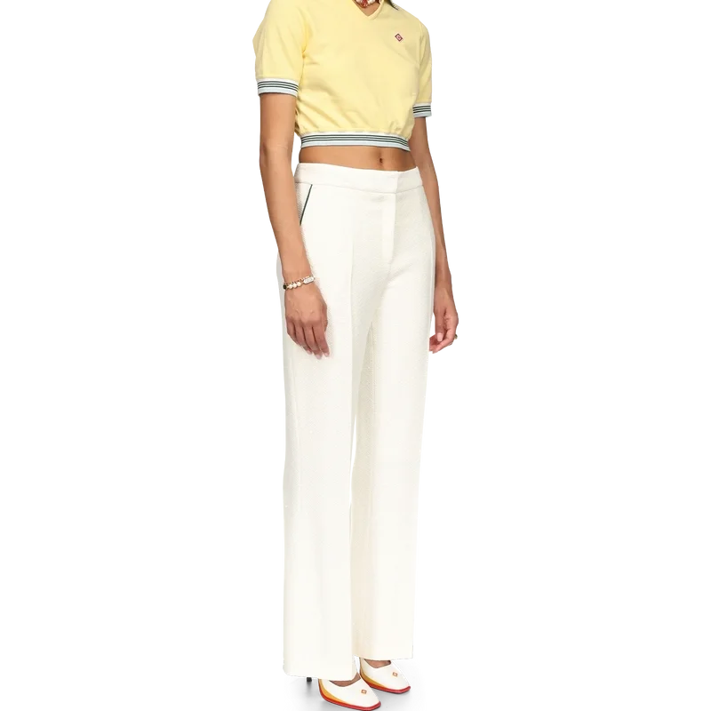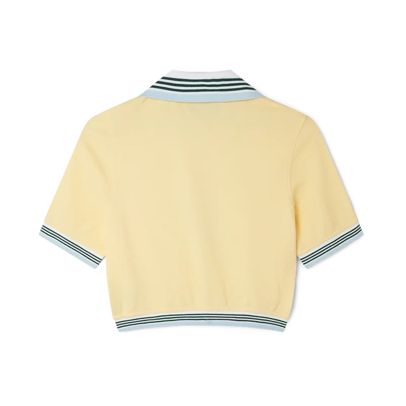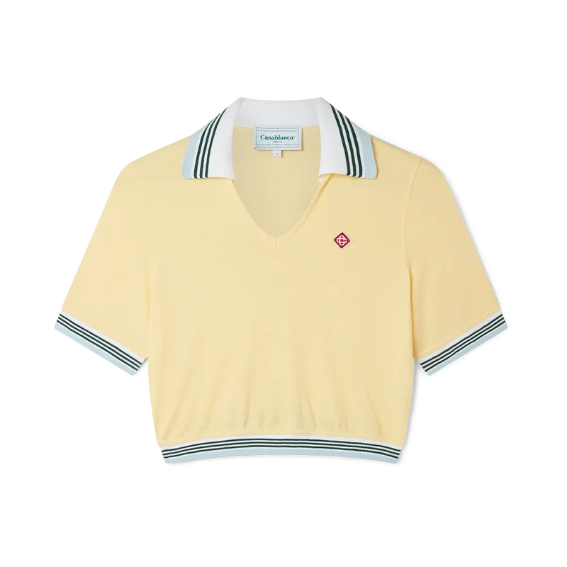 El polo corto de piqué es un diseño de manga corta y cuello en V con el bajo ligeramente fruncido. Confeccionado en tejido de piqué 100 % algodón, cuenta con cuello y puños acanalados con detalles de rayas, etiqueta con la marca Casablanca y el logotipo del diamante de la casa.