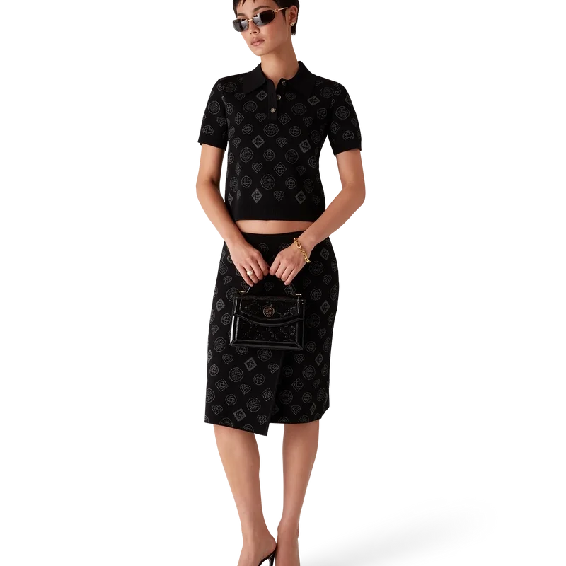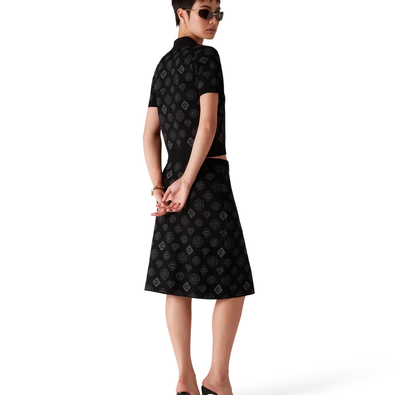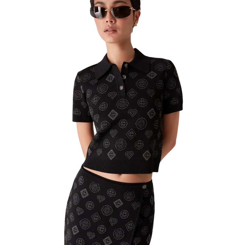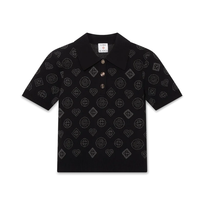 El polo de jacquard con monograma es un diseño de manga corta que presenta el motivo repetido del logotipo Honeydew de la casa. Este motivo se diferencia de nuestros otros monogramas, ya que combina formas únicas para formar un patrón cohesivo. Se trata más bien de un diseño basado en iconos. Se completa con cierre de botones, botones chapados en oro con el logotipo entrelazado CC característico, y cuello, puños y bajo acanalados.