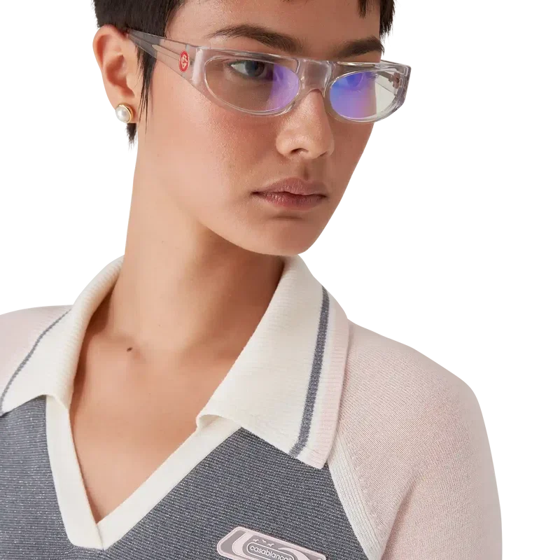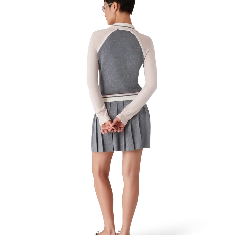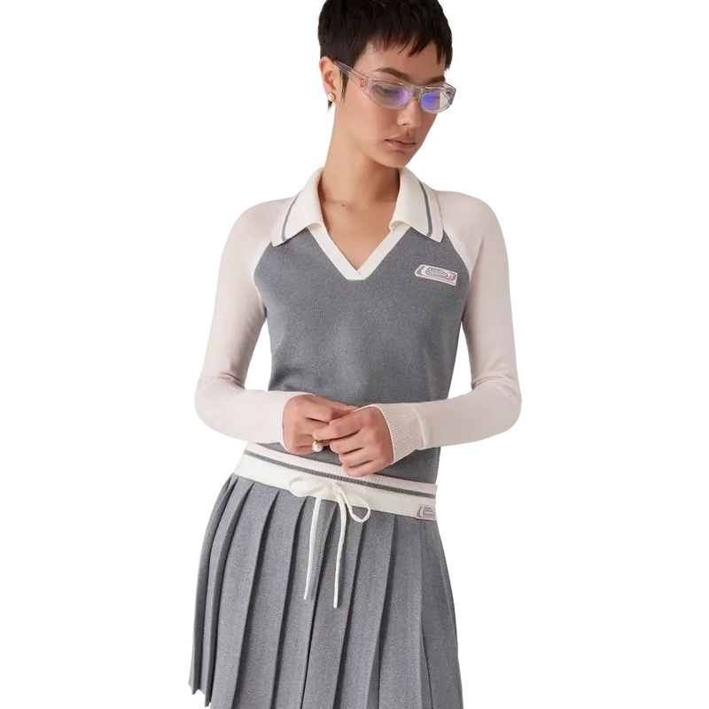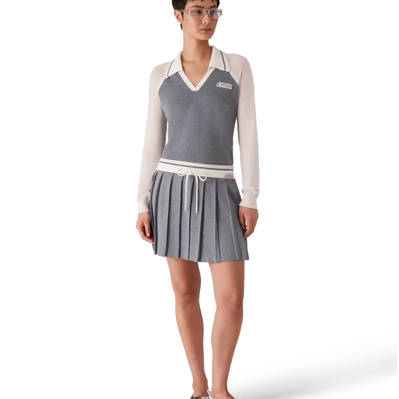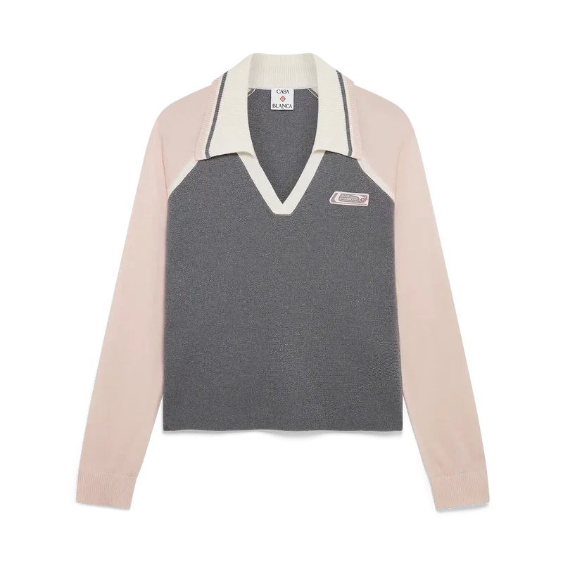 El polo de manga larga Merino Tennis es un diseño de punto que presenta el parche con el logotipo de silicona de la casa. Se completa con un cuello acanalado con detalle de ribete a rayas, cuello en V y mangas raglán con detalle de ribete acanalado.
