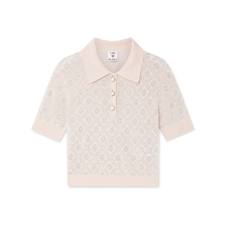 La camisa de punto con monograma de cristal es un diseño corto confeccionado en tejido de lana merina y decorado con el monograma de cristal de la casa. Se completa con los característicos botones de perla con ribete dorado, cuello, puños y bajo acanalados, y está diseñada para quedar por encima del ombligo.