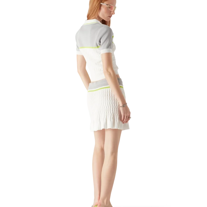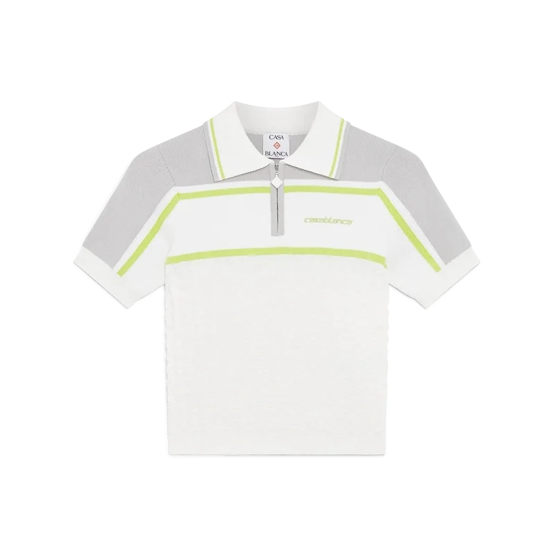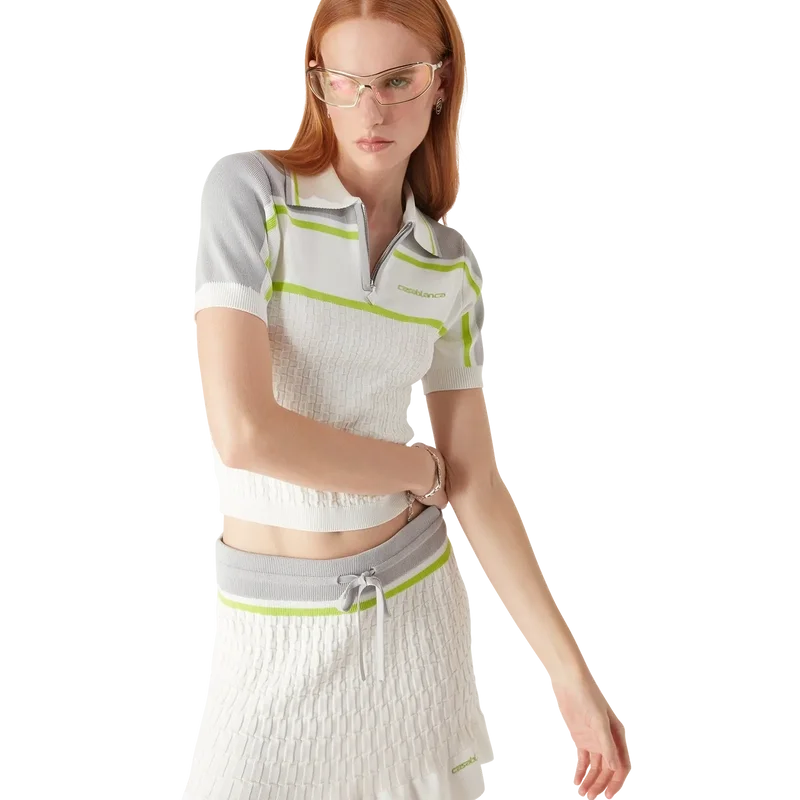 El polo de tenis es un diseño de punto con hombros y mangas exteriores en contraste. Se completa con cierre de cremallera, cuello con detalle de ribete a rayas, el logotipo característico de Casablanca y puños y dobladillo acanalados.