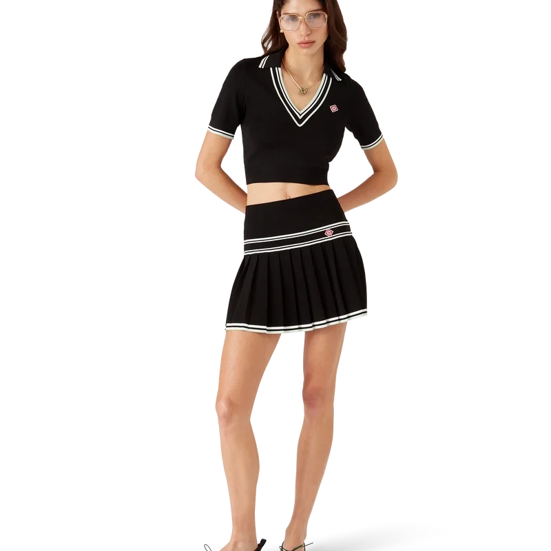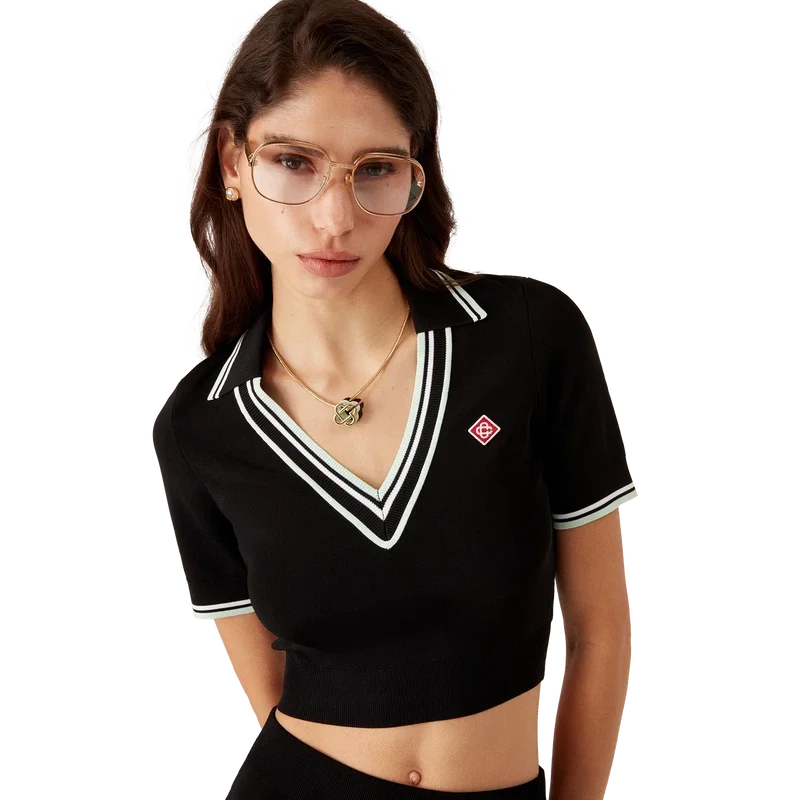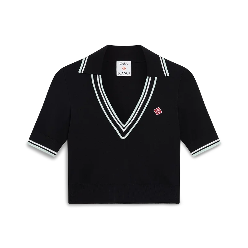 El polo de viscosa con cuello en V es un modelo corto confeccionado en tejido de punto y decorado con el emblemático logotipo de rombos de la marca. Se completa con cuello, puños y bajo acanalados con detalles de rayas verdes y blancas en contraste, y un profundo cuello en V.