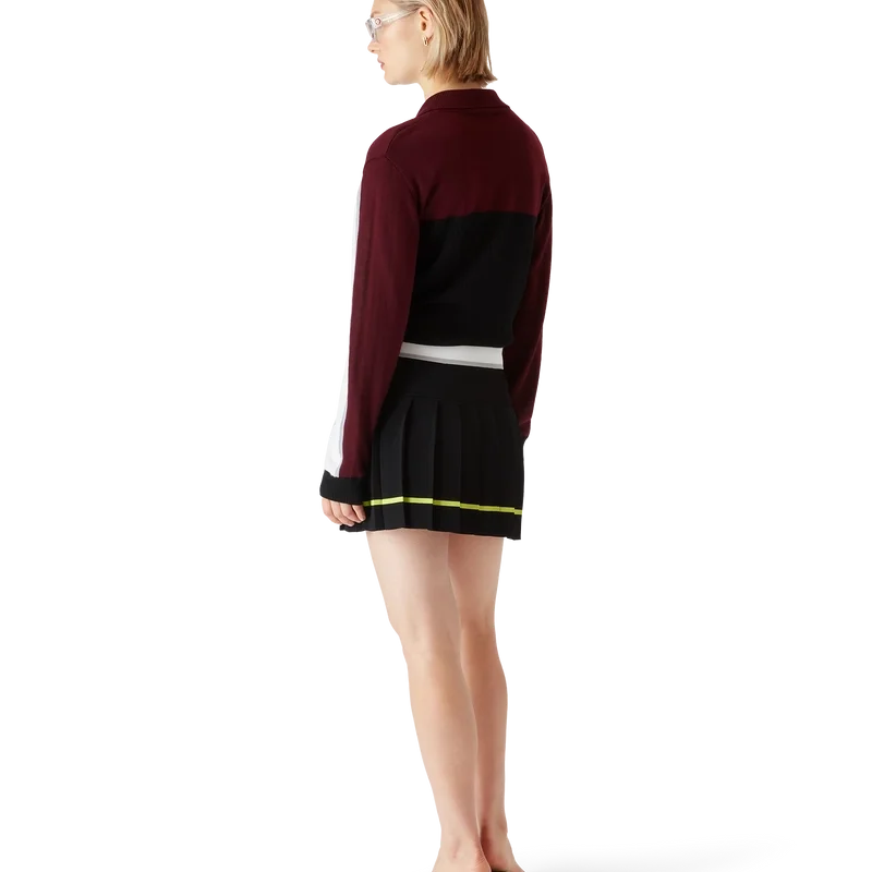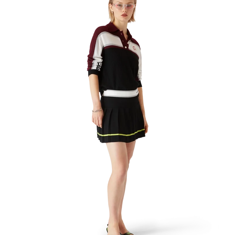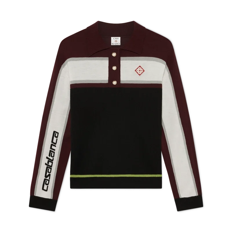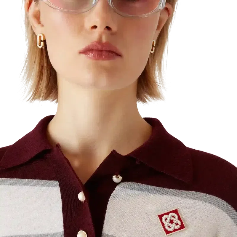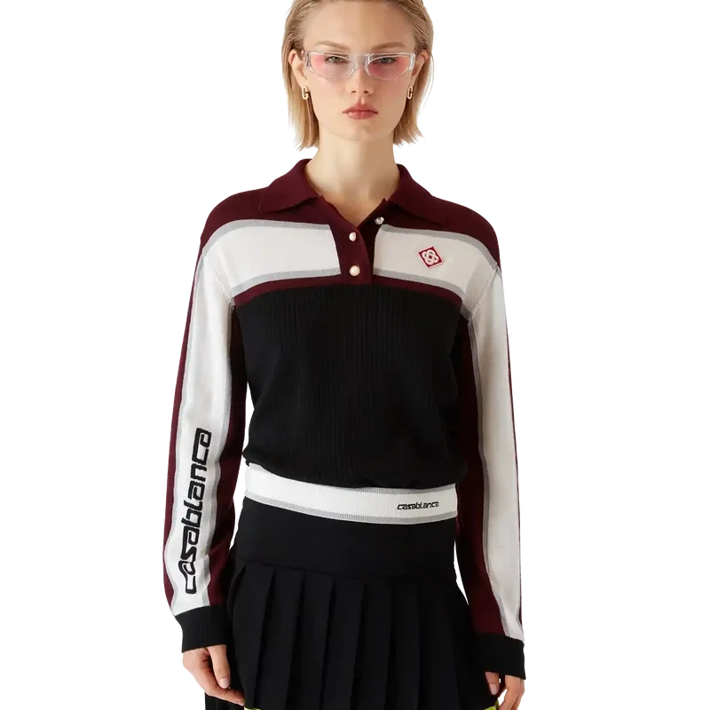 El polo de manga larga oversize a rayas es un diseño relajado de estilo sport de Apras que luce el logotipo del diamante de la casa. Se completa con el logotipo de Casablanca en una de las mangas, un panel acanalado en el cuerpo, una tapeta con botones de perla con borde dorado característicos, y detalles acanalados en el cuello, los puños y el bajo.