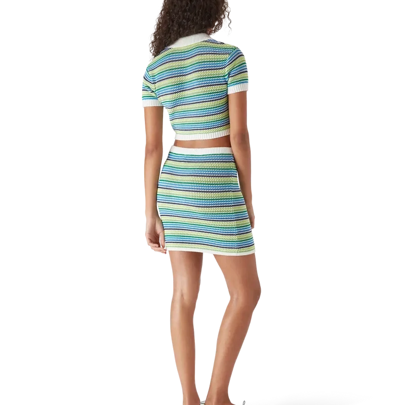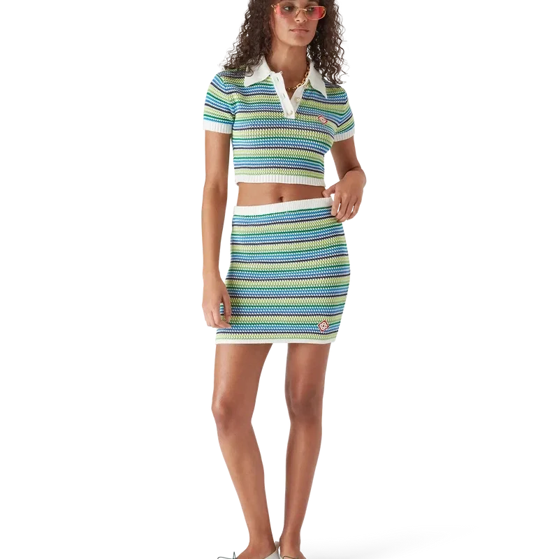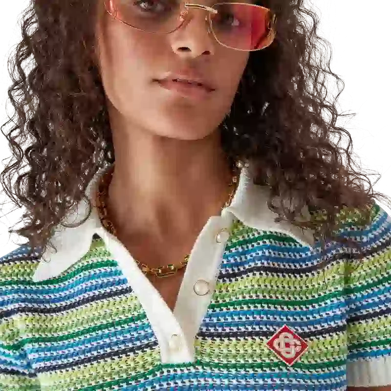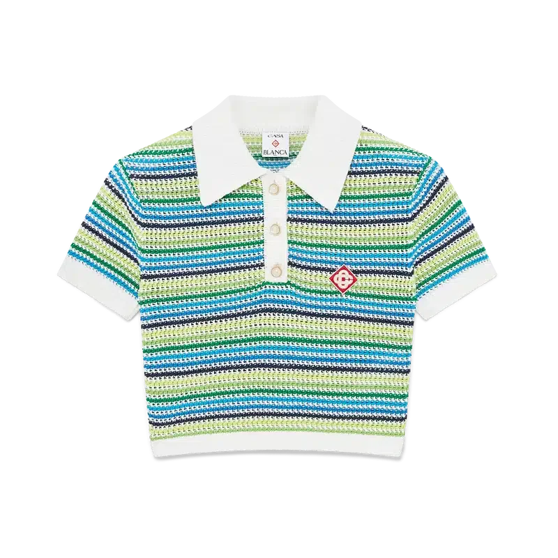El polo a rayas es un diseño corto de manga corta que luce el emblemático logotipo de diamante de la casa. Se completa con tejido de punto a rayas, tapeta de botones, botones de perla con borde dorado característicos y detalles de cuello, puños y bajo acanalados.