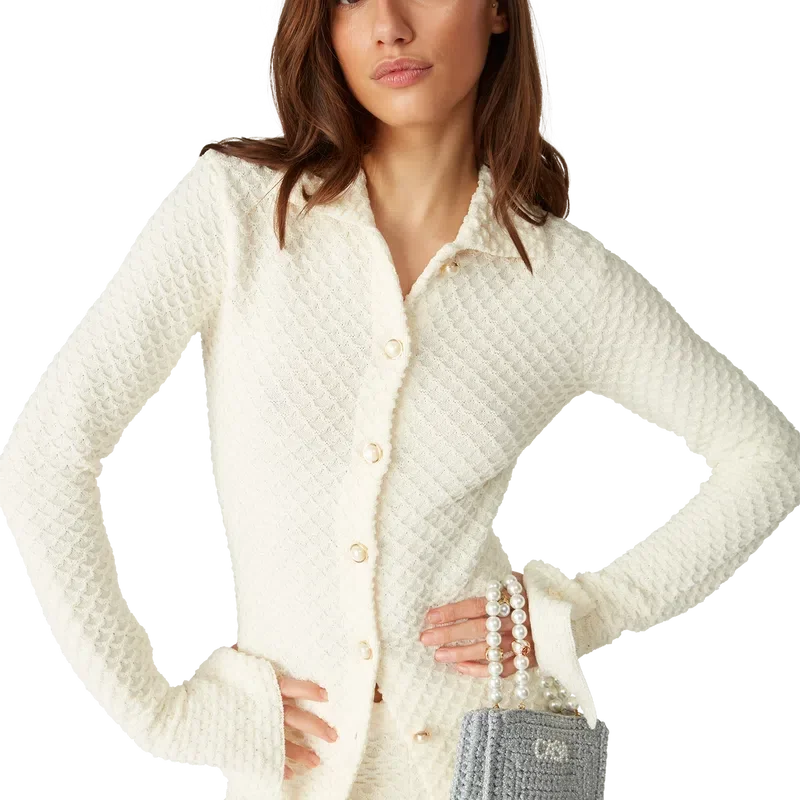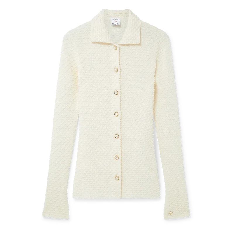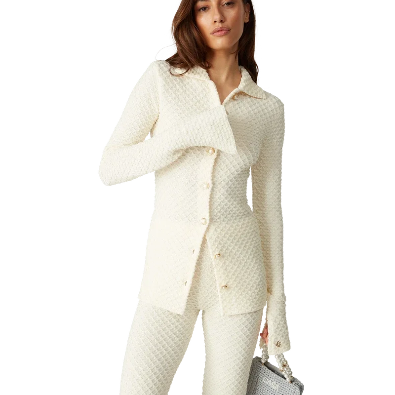 La camisa de punto texturizado es un diseño de manga larga confeccionado en tejido de mezcla de algodón. Cuenta con cuello, mangas acampanadas con aberturas, cierre frontal con botones, botones de perla con borde dorado característicos y un remache Cc entrelazado chapado en oro.