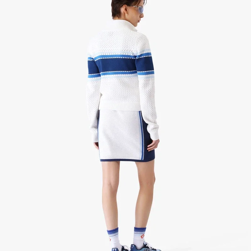 La chaqueta bomber de malla a rayas blancas y azules presenta un diseño de punto refinado, con una raya azul que recorre el pecho y la espalda. Se completa con el logotipo de diamante característico de la casa, un cuello acanalado clásico con detalle de ribete a rayas, cierre de cremallera, puños y bajo elásticos, y una silueta holgada que encarna el enfoque sofisticado de la casa hacia el estilo deportivo-casual.