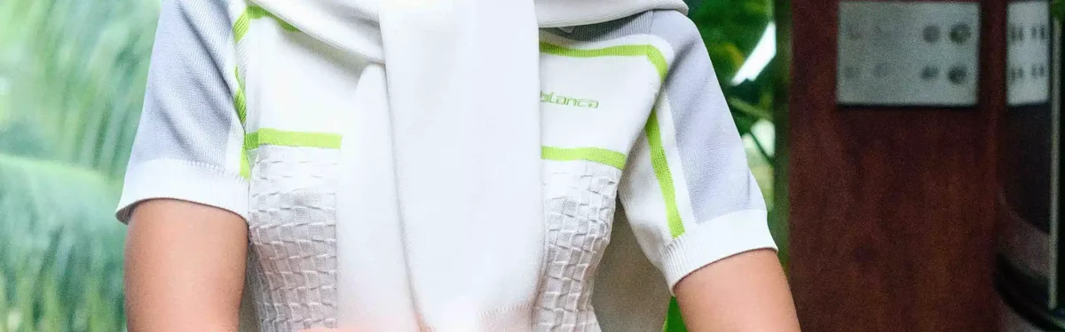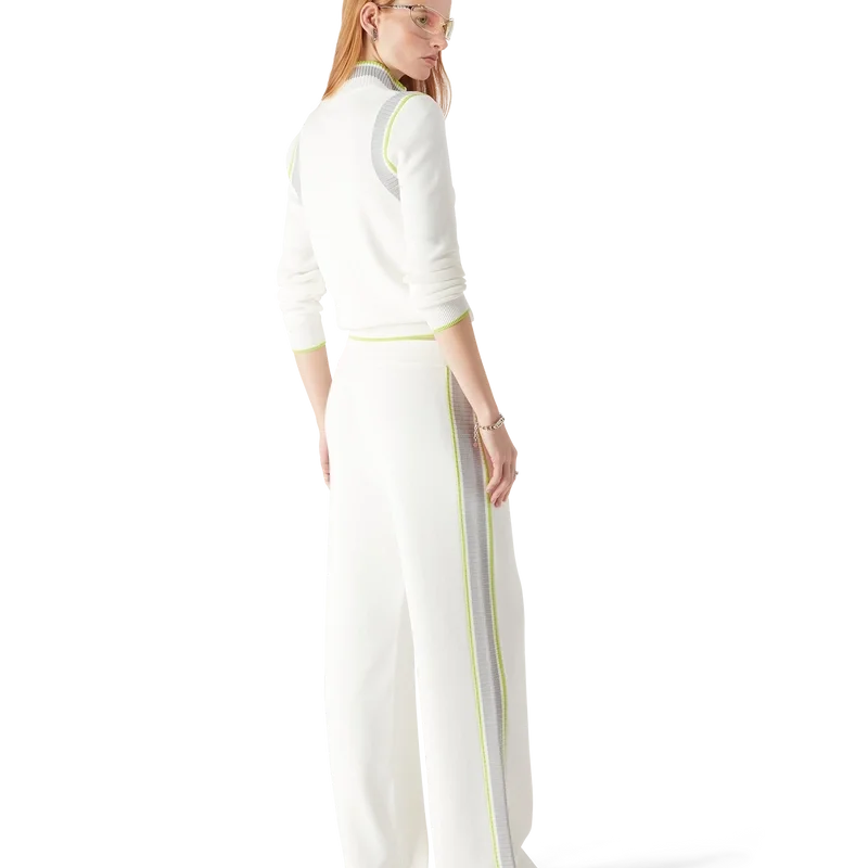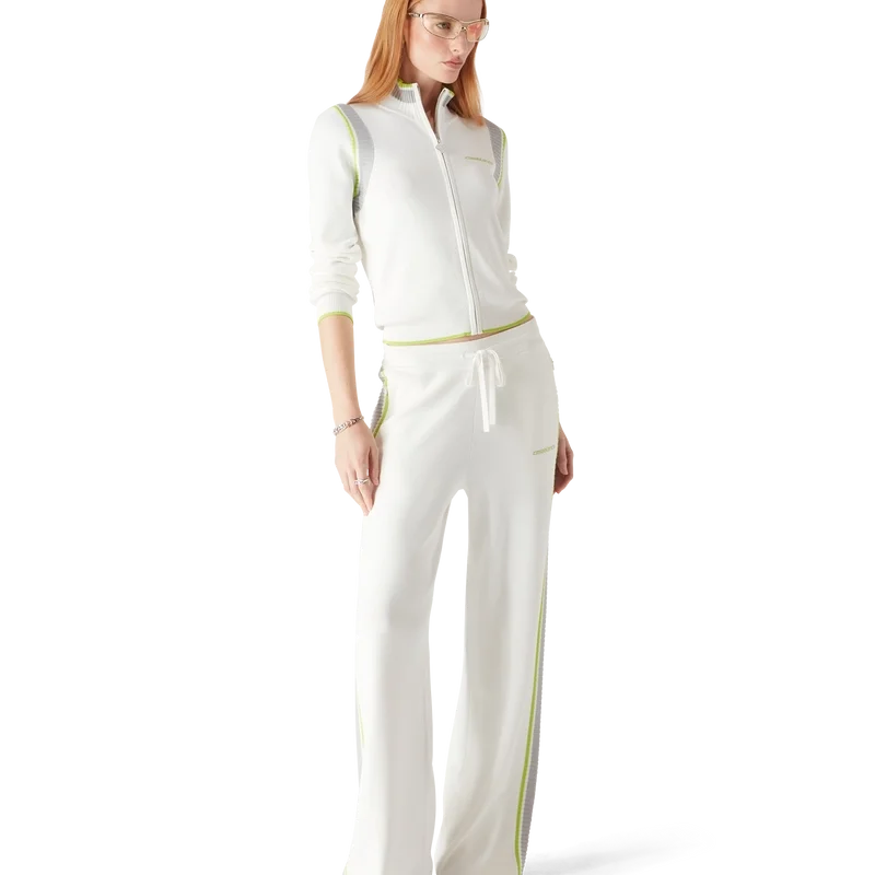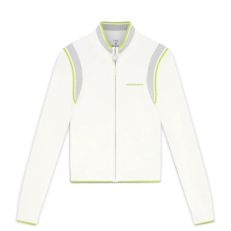 La chaqueta de tenis de manga larga con cuello es un diseño inspirado en la ropa deportiva que luce el logotipo de Casablanca en verde. Se completa con un cierre de cremallera con la lengüeta en forma de diamante característica de la casa, cuello alto de punto, puños, dobladillo y detalles en las sisas, y una silueta holgada.