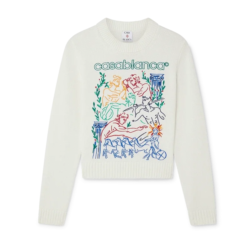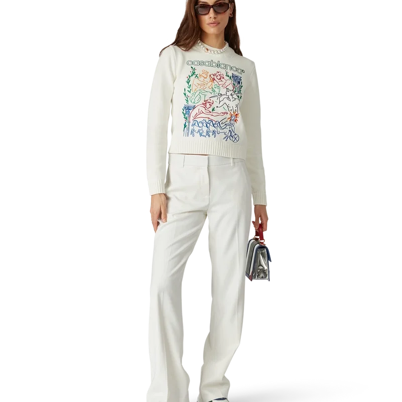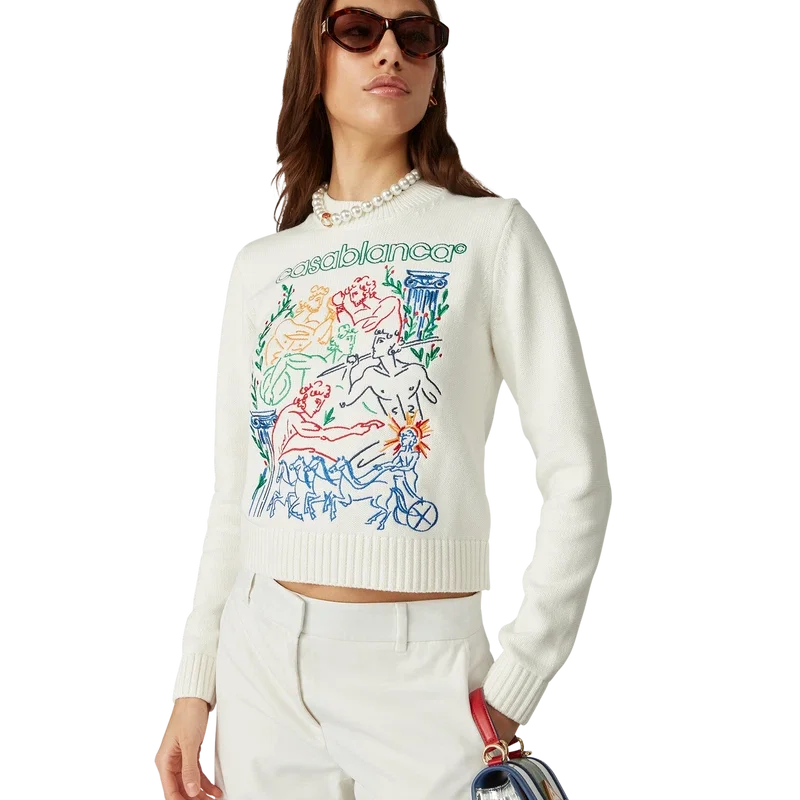 El jersey bordado es un diseño de manga larga confeccionado en tejido de algodón de punto con el motivo bordado de temporada de la casa. Se completa con un clásico cuello redondo y puños, cuello y bajo acanalados.