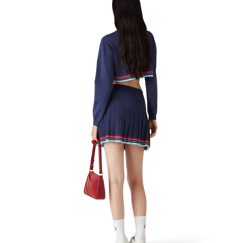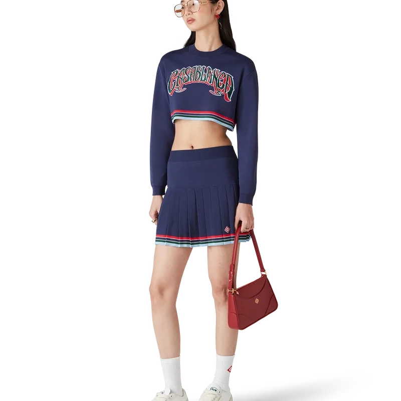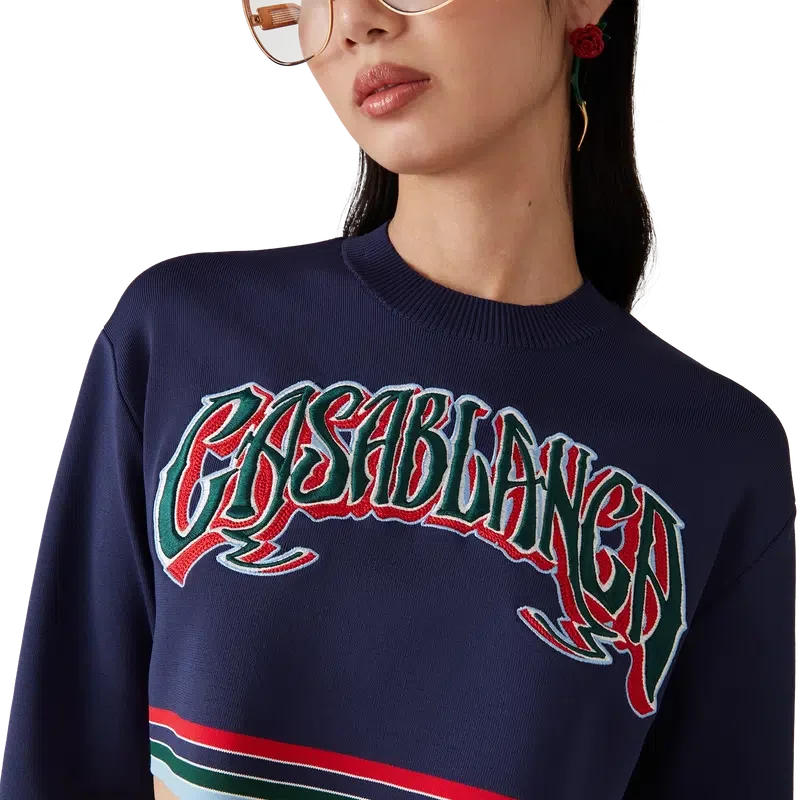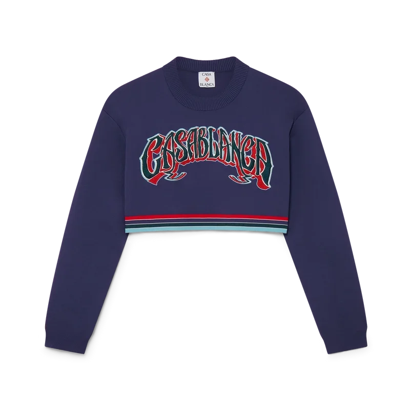 El jersey corto de estilo béisbol está confeccionado en tejido tricot y presenta el logotipo de Casablanca bordado con tipografía dibujada a mano, inspirada en la tipografía gótica utilizada en los tatuajes. Cuenta con cuello y puños acanalados, y un detalle de rayas horizontales en rojo, blanco, azul, verde y azul marino en el bajo.