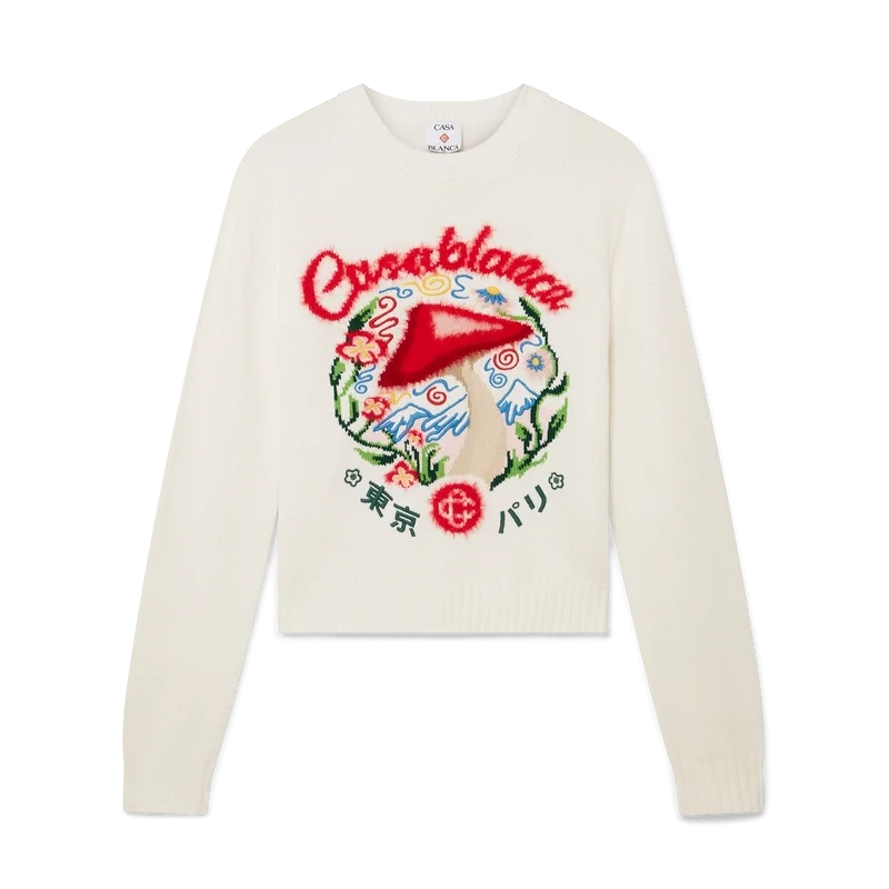 El jersey de algodón bordado con setas es un diseño de manga larga que presenta uno de los elementos de diseño característicos de la casa —la seta— confeccionado en tejido de algodón. Se completa con un cuello redondo clásico y puños y bajo acanalados.