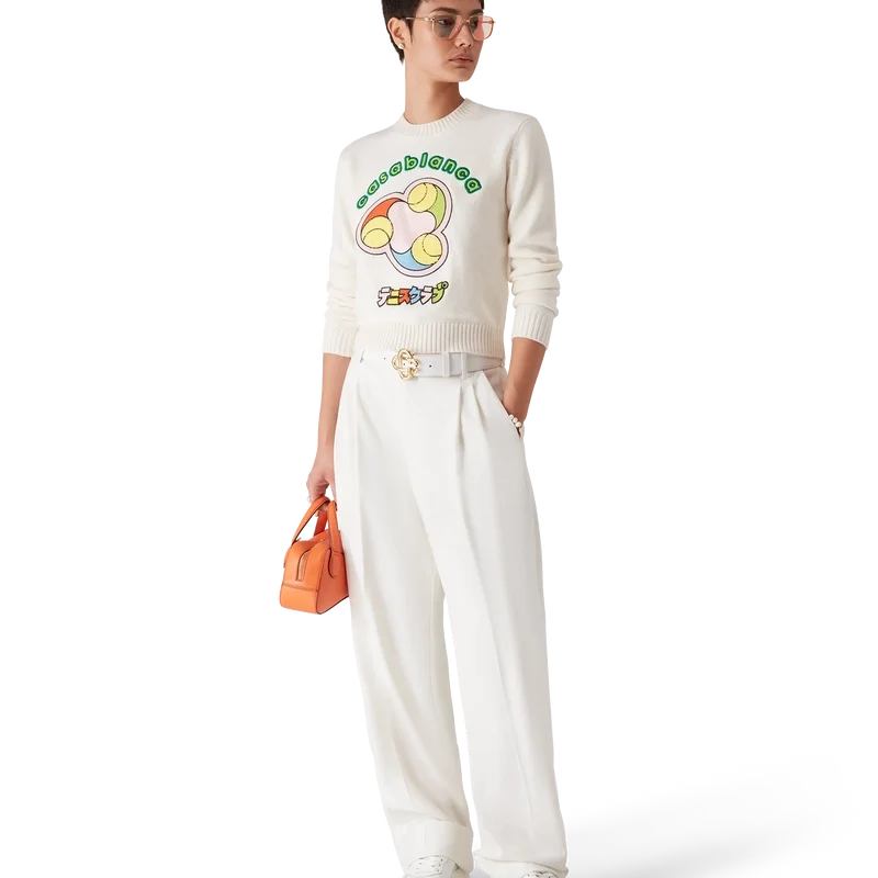 El jersey de cuello redondo de punto merino «Tennis Ball» es un diseño de manga larga que presenta el estampado de la temporada, inspirado en el mundo del kawaii y el manga, y que juega con la iconografía de Casablanca utilizando pelotas de tenis en lugar de naranjas para darle un toque divertido. Se completa con cuello, puños y bajo acanalados clásicos.