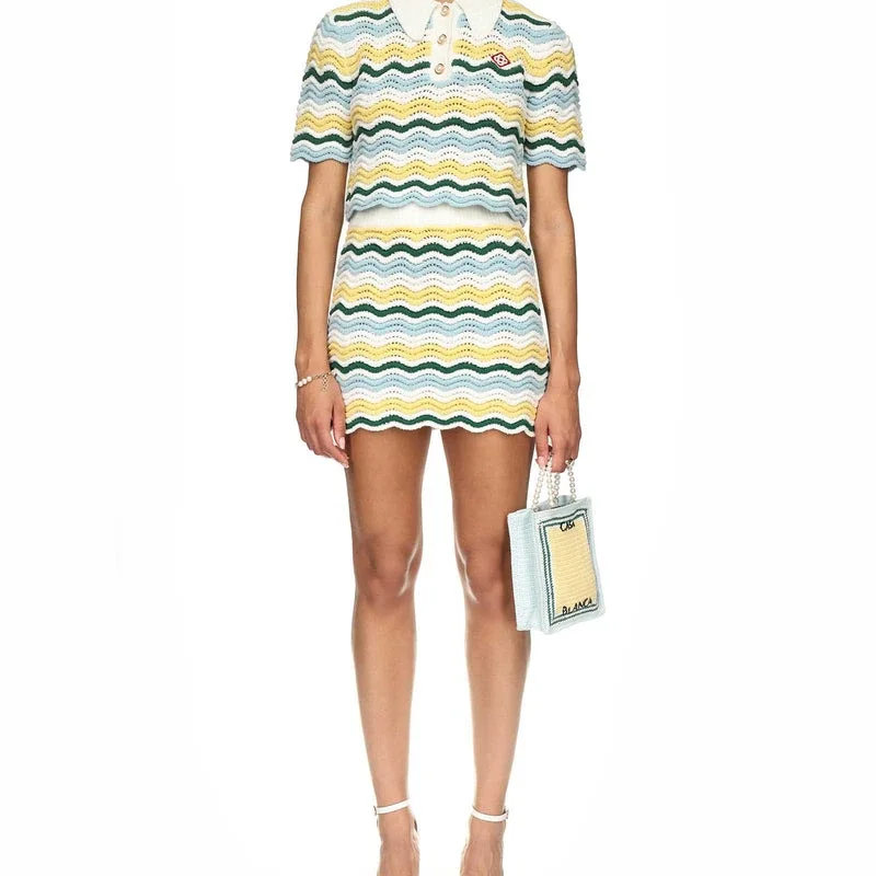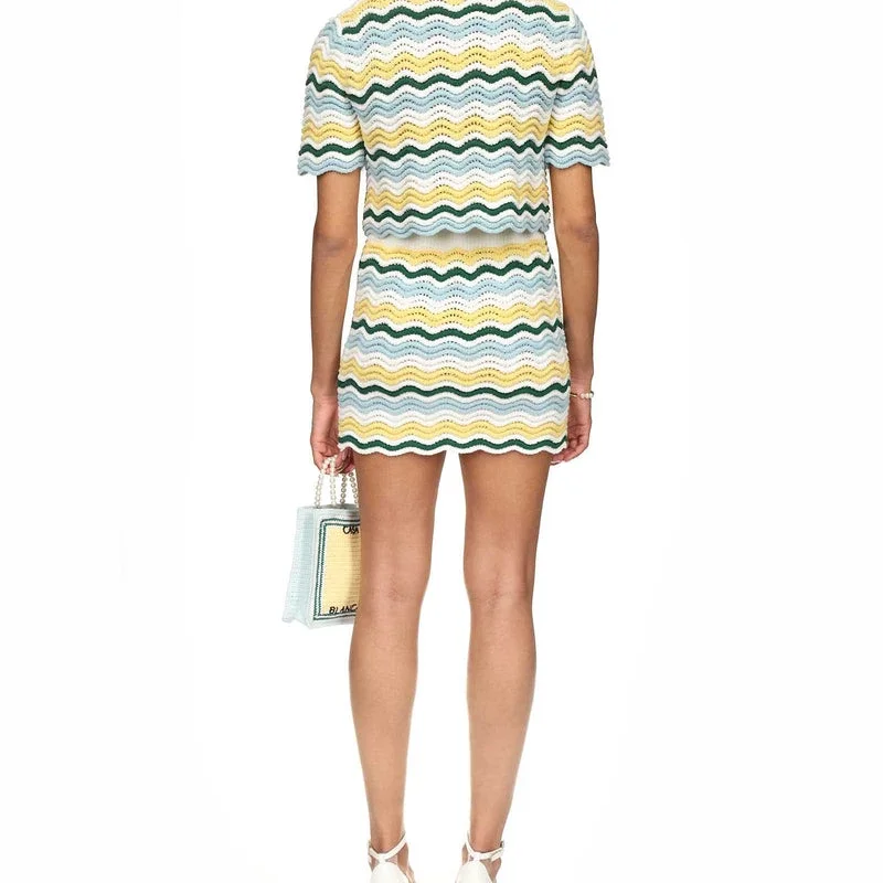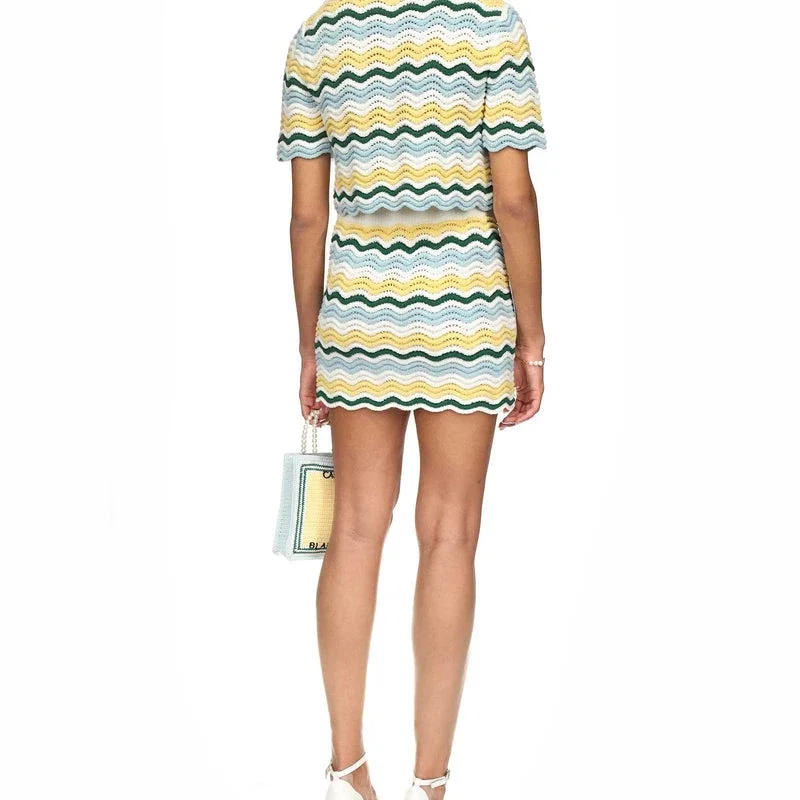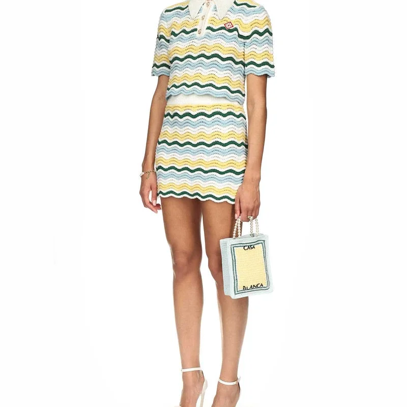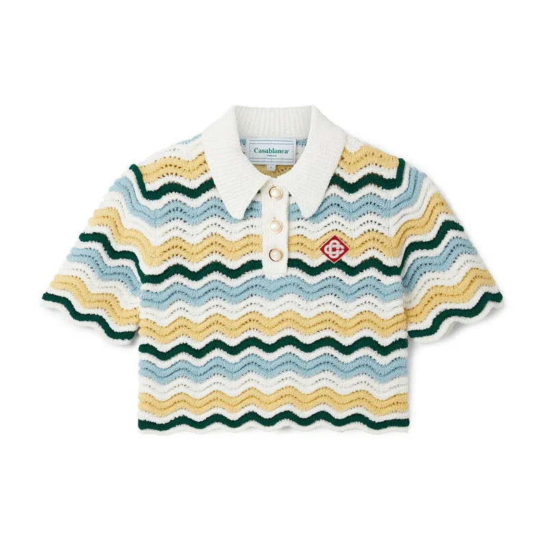 El top Boucle Wave es un modelo emblemático de Casablanca de manga corta confeccionado en tejido de ganchillo de textura suave y trama abierta, con cuello y tapeta acanalados en blanco. Rematado con el logotipo de diamante de la casa y la etiqueta de la marca Casablanca Paris, este tejido de punto de mezcla de algodón y nailon está diseñado con un corte entallado.