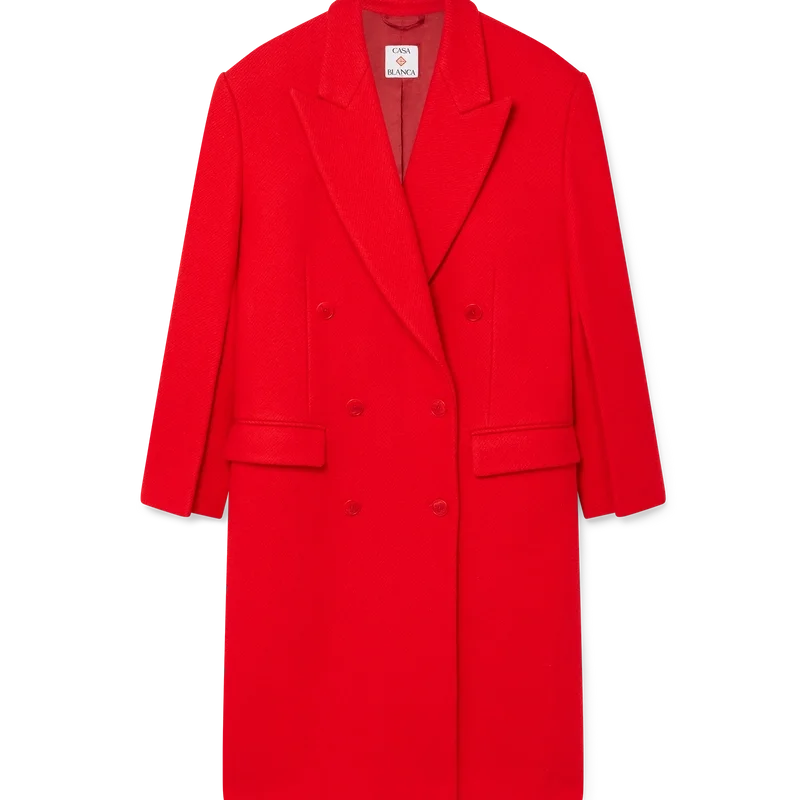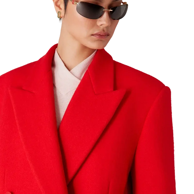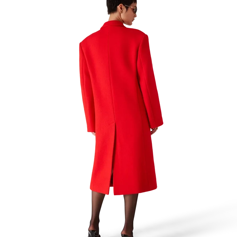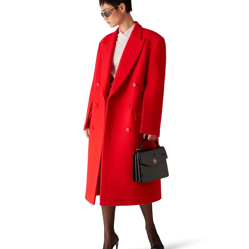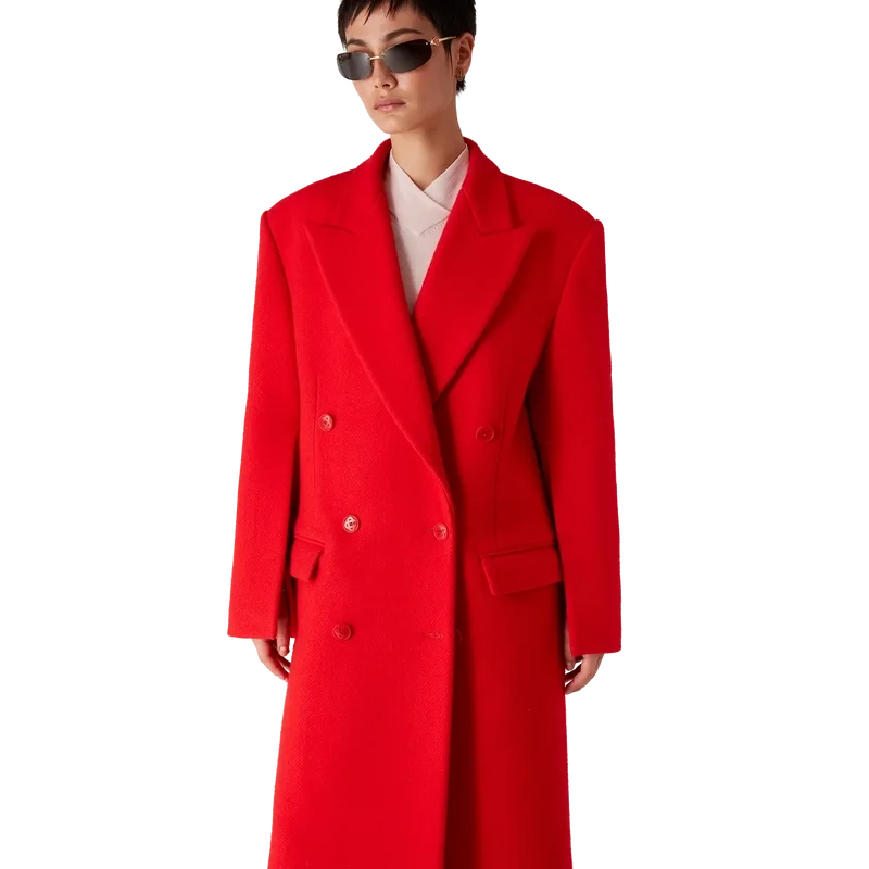 El abrigo entallado presenta un diseño clásico de doble botonadura. Cuenta con solapas en pico, bolsillos con solapa, cierre de botones, botones de corozo entrelazados, forro, abertura trasera y mangas largas con pliegues en la parte inferior.