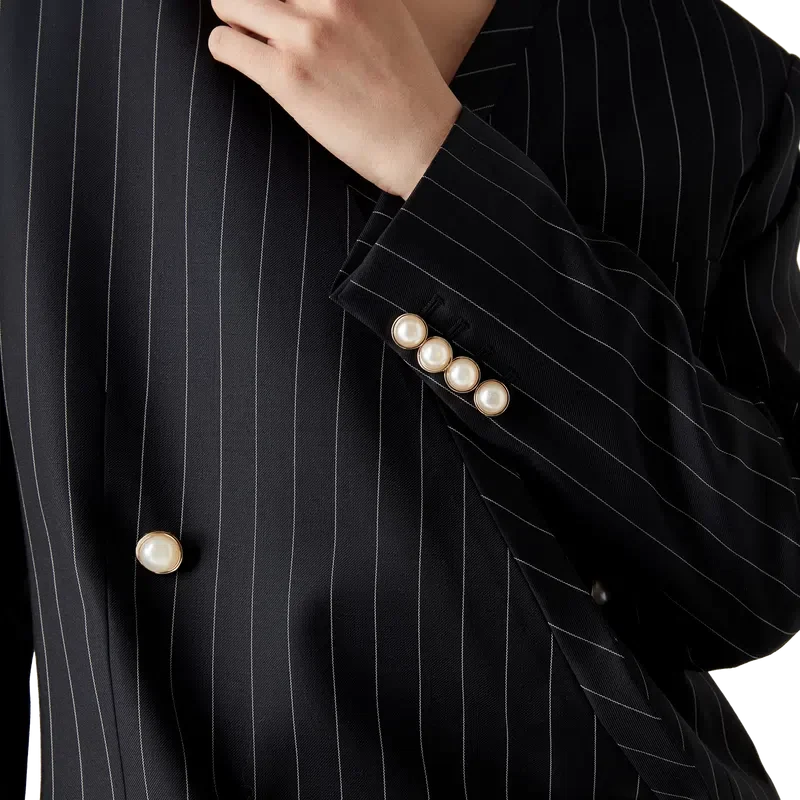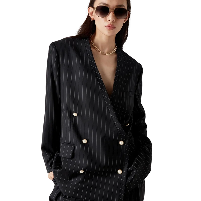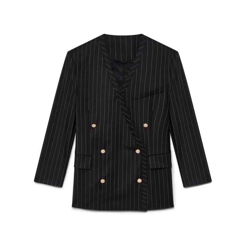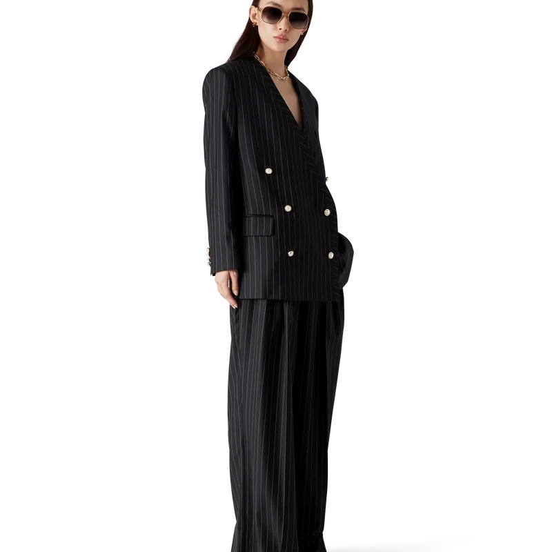 La chaqueta oversize de lana a rayas finas es un diseño sin cuello y de doble botonadura confeccionado en tejido de lana virgen. Cuenta con cierre de botones, botones de perla con ribete dorado, bolsillos con solapa en la parte delantera y una abertura trasera.