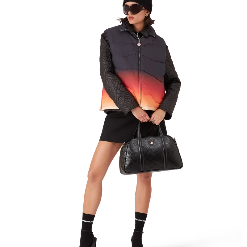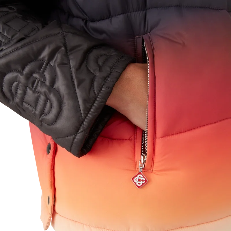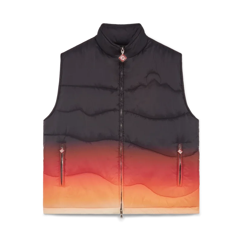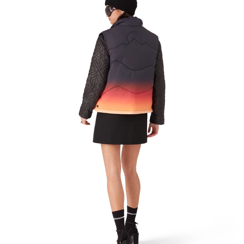 El chaleco acolchado de nailon degradado es una prenda de ropa de abrigo de diseño refinado confeccionada con tejido de nailon estampado en degradado, inspirada en las impresionantes transiciones de color del amanecer y el atardecer sobre la campiña nevada de Japón. Evoca momentos espectaculares en los que cielos vibrantes iluminan paisajes montañosos rurales y los pueblos resplandecen contra dramáticos fondos alpinos.