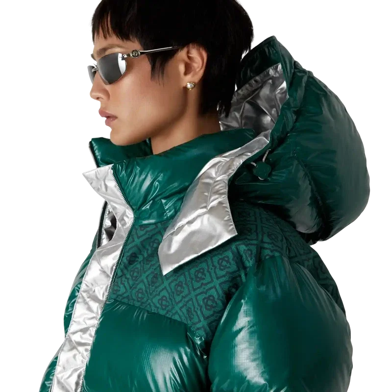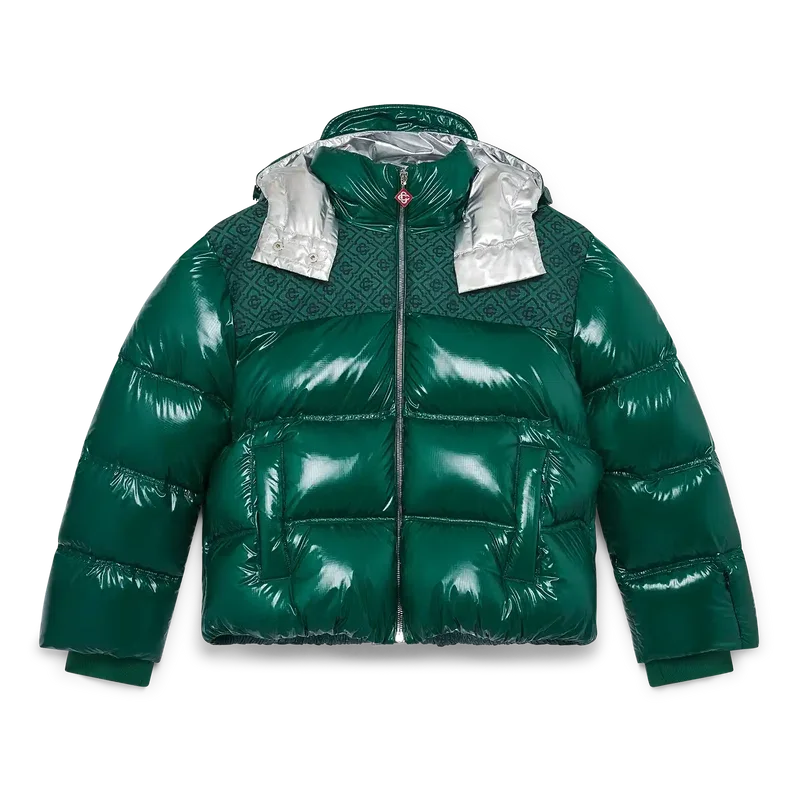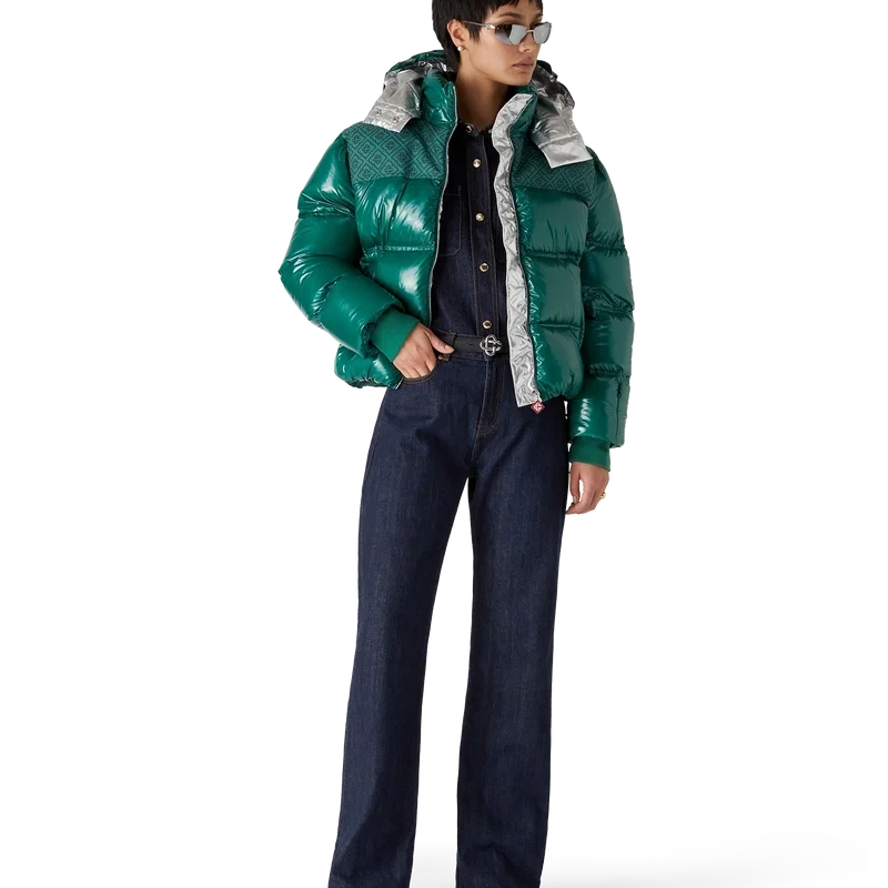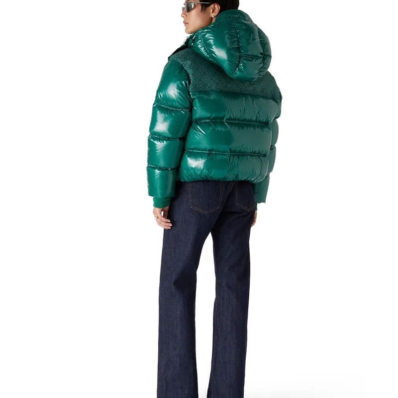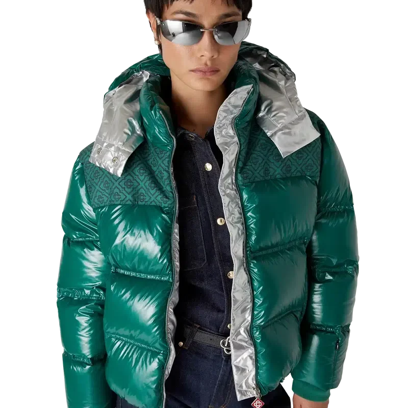 La chaqueta acolchada de nylon es una prenda de ropa de abrigo de corte cuadrado y diseño moderno, confeccionada en tejido de nylon ripstop con relleno de plumón y un panel de jacquard con el monograma en contraste en los hombros. Se completa con una capucha con cordones y cierres con el logotipo de CC, un cuello alto que proporciona calor adicional y protección contra las inclemencias del tiempo, un cierre de cremallera con la lengüeta con el logotipo de diamante característico de la casa, bolsillos delanteros con cierre de cremallera, correas ajustables con el logotipo de la marca en los puños y dobladillo y puños elásticos.