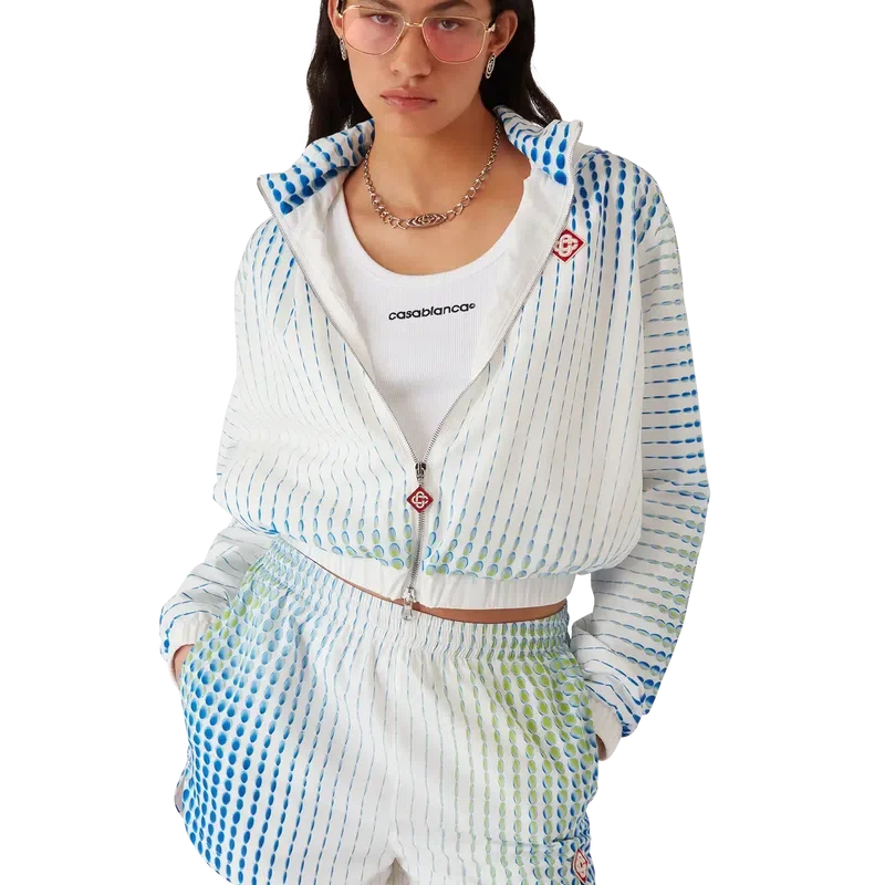 La chaqueta cortavientos Dots es un diseño deportivo confeccionado en tejido de tafetán técnico con el estilo característico de la casa, que presenta motivos degradados y efectos de textura. Se completa con manga larga, capucha con cierre de cordón, puños y bajo elásticos, cierre de cremallera con la lengüeta con el diamante característica de la casa y el logotipo del diamante de la casa.
