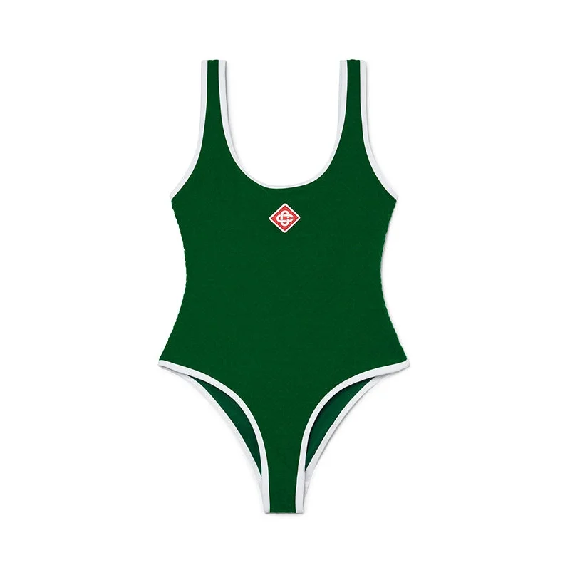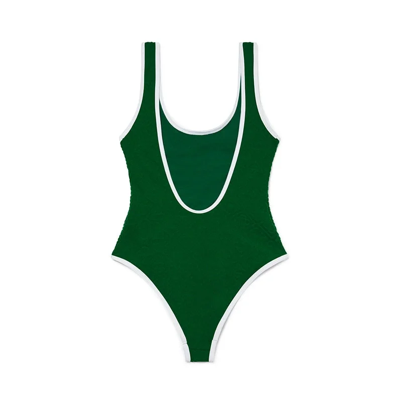 El bañador de una pieza Monogram verde presenta una silueta clásica con corte alto en las piernas y cuello redondo que le confiere un aire nostálgico. Confeccionado en jersey Monogram 3D, este modelo cuenta con ribetes blancos y el emblemático Diamond Monogram de la casa en el pecho.