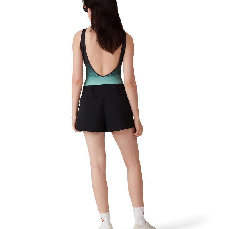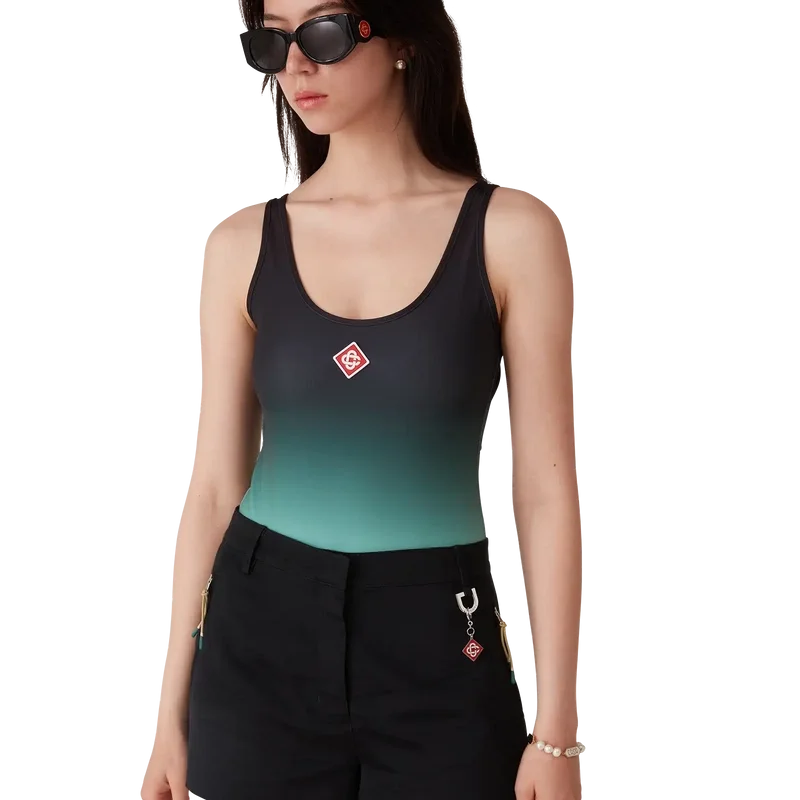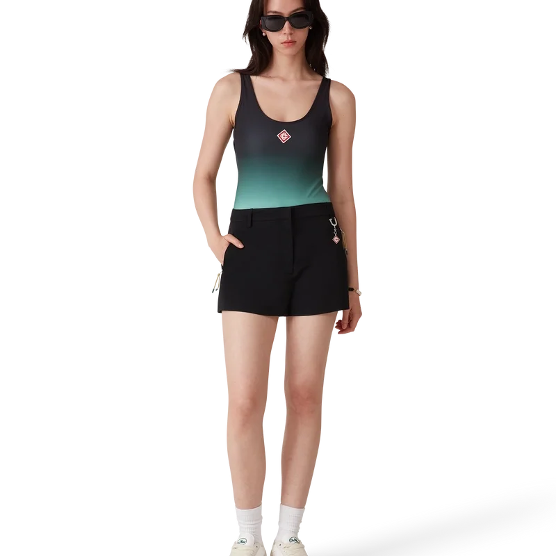 El bañador degradado es un diseño estampado confeccionado con un tejido técnico transpirable para baño, que presenta un degradado en color menta inspirado en la paleta de colores del Park Hyatt, un emblemático hotel de Tokio que utiliza el menta y el negro en su diseño interior. Se completa con corte alto en las piernas, cuello redondo, espalda con aberturas y el logotipo de diamante característico de la casa en el pecho.