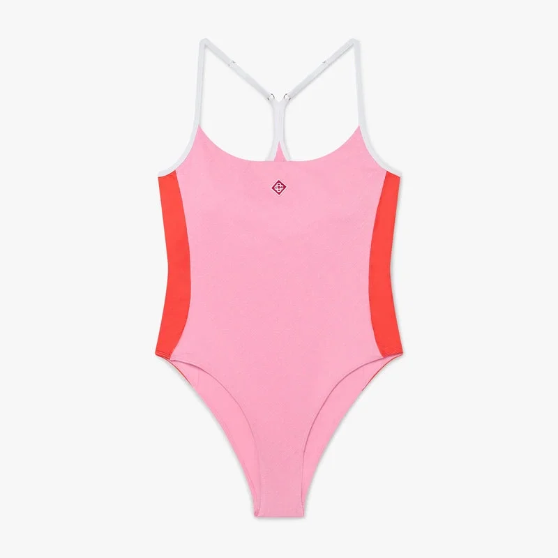 El bañador rosa con monograma es un refinado diseño de una pieza que presenta el característico estampado Monogram de la casa en una vibrante combinación de colores rosa, rojo y blanco. Se completa con cuello redondo, tirantes blancos ajustables, paneles laterales rojos, corte alto en las piernas y el característico logotipo de diamante de la casa en el pecho.