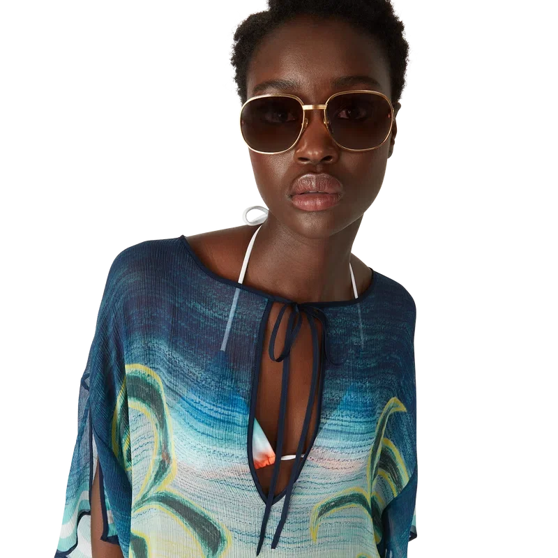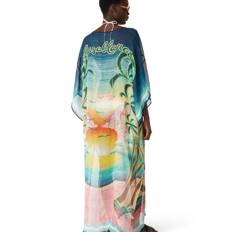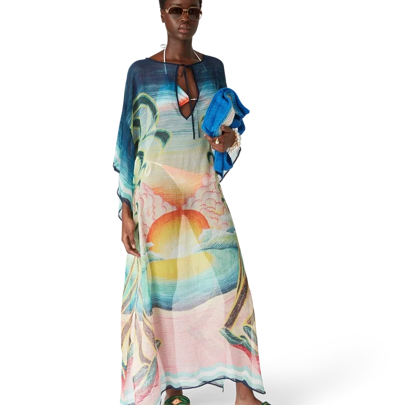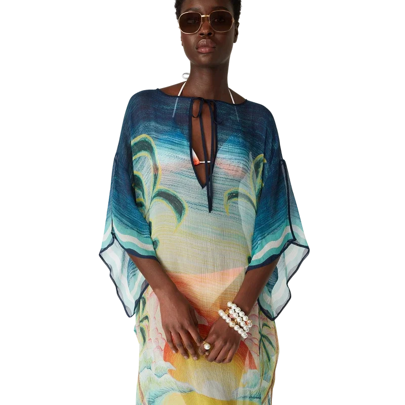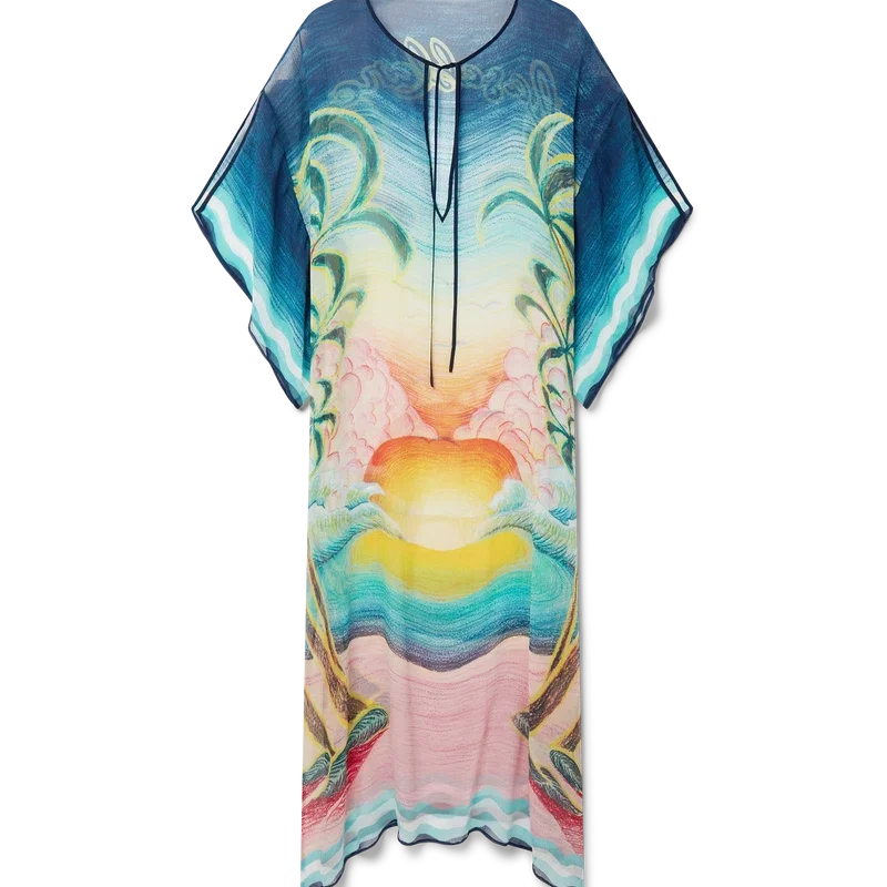 El caftán Danse De La Mer es un diseño ligero de corte holgado confeccionado en tejido de seda estampado con escenas pintadas a mano creadas especialmente para la colección. Se completa con mangas anchas, aberturas laterales y cuello en V con cierre de cordón.