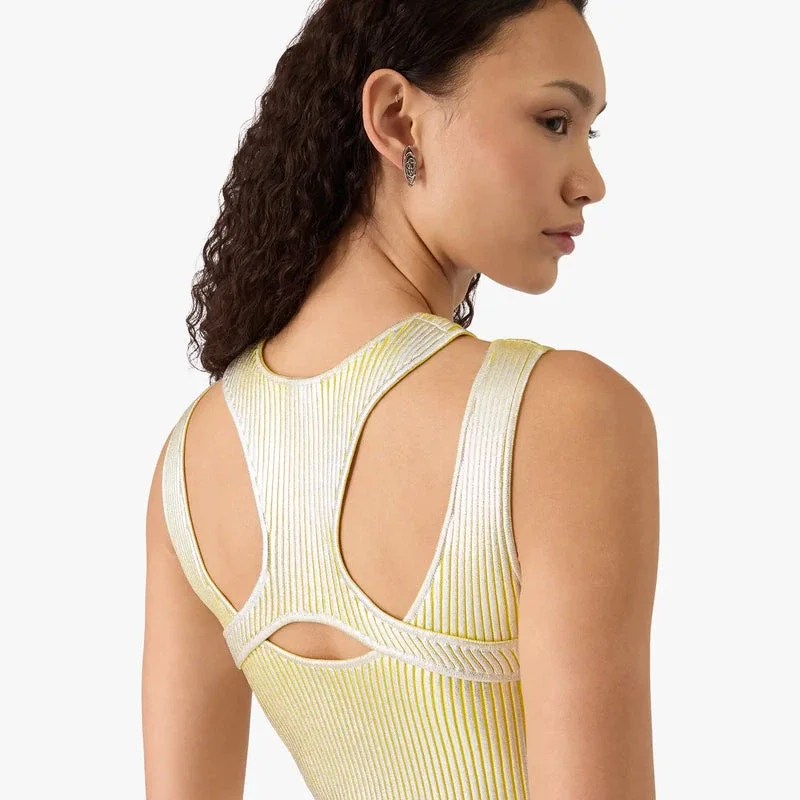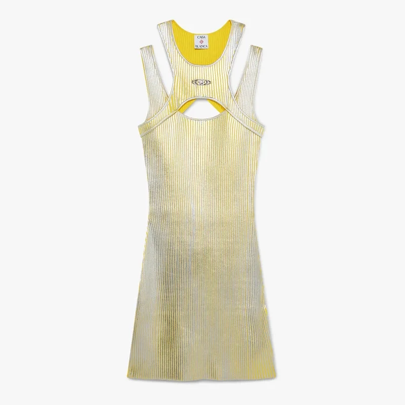 El vestido con estampado en lámina dorada es un diseño de punto refinado sin mangas que luce el logotipo de la casa en urdimbre plateado. Se completa con una espalda nadadora y una favorecedora silueta mini que encarna los códigos de diseño de la casa.