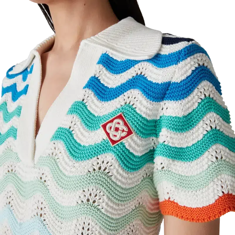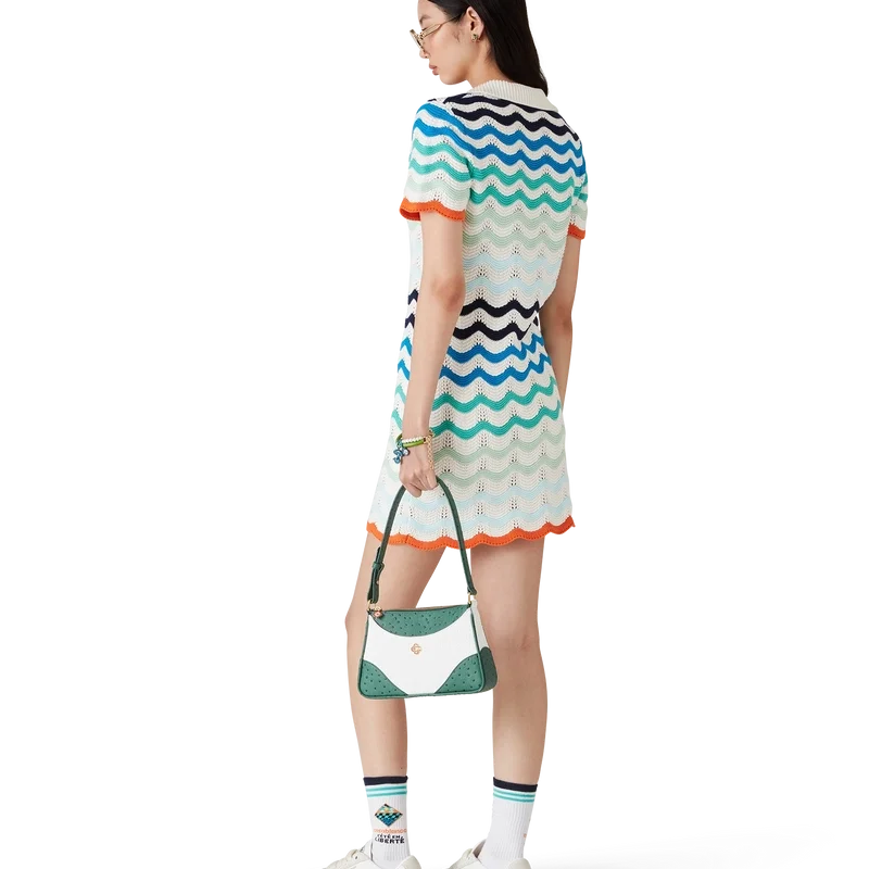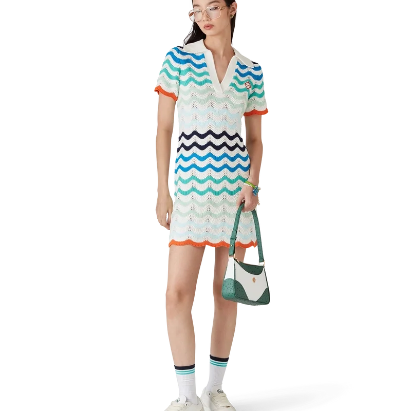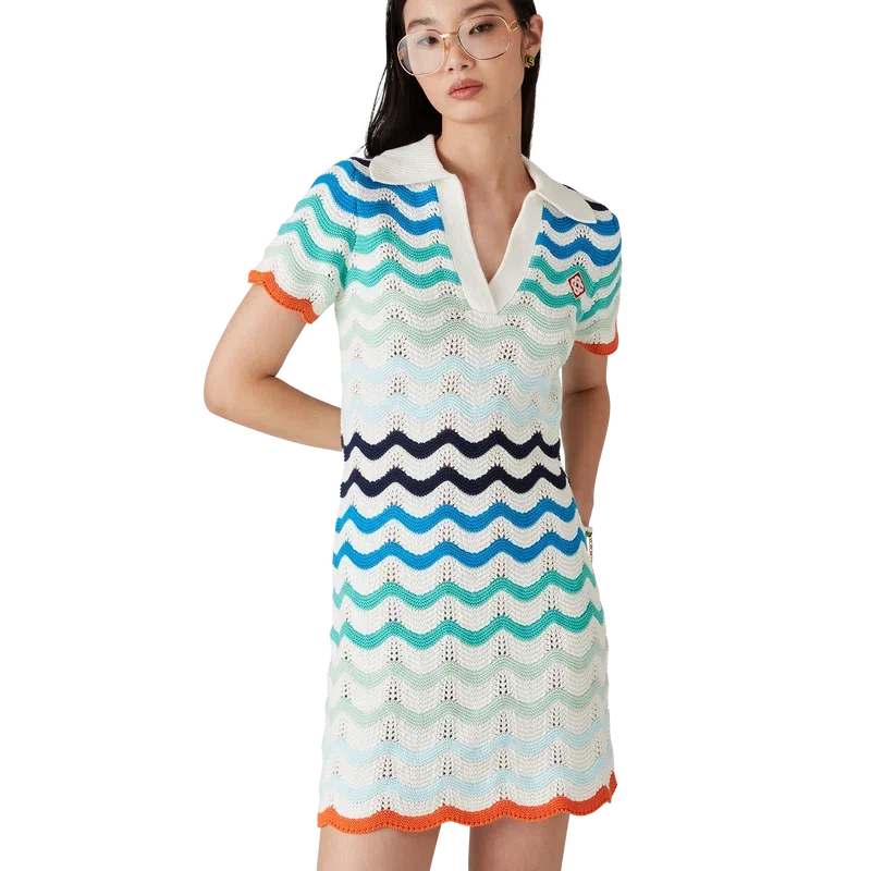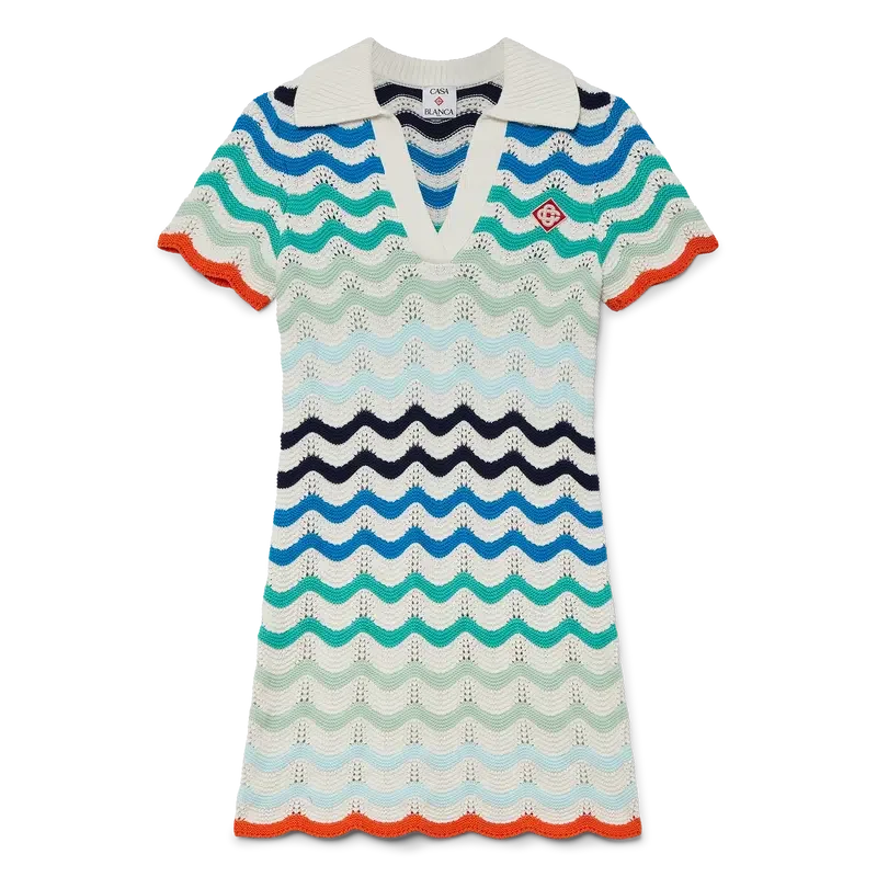 El vestido de croché con ondas degradadas es un diseño mini de manga corta confeccionado en tejido de algodón de croché que presenta el elemento de diseño de la casa inspirado en las ondas de Memphis en colores degradados. Se completa con cuello en V, cuello y detalle de ribete en contraste en los puños y el dobladillo.