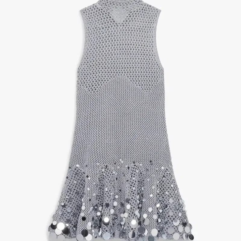 El minivestido de ganchillo plateado es un refinado diseño de punto con corte en A, que destaca por su delicada confección en ganchillo plateado con efecto espejo. Se completa con un cuello alto, un corpiño ajustado y una silueta sin mangas.