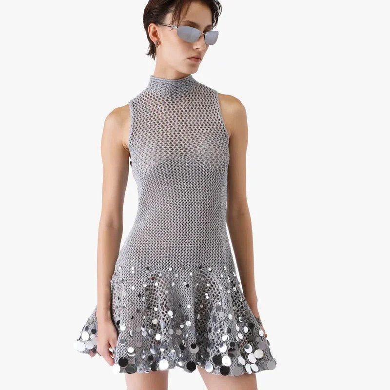 Minivestido de ganchillo plateado con efecto espejo