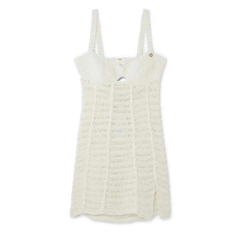 El vestido bustier de croché es un modelo mini confeccionado en tejido de mezcla de algodón de punto abierto, con un bralette ajustado y una espalda muy escotada. Se completa con cierre de corchetes, un remache entrelazado Cc chapado en oro y tirantes.