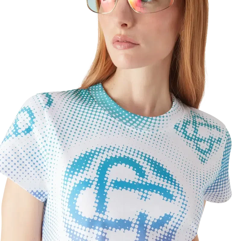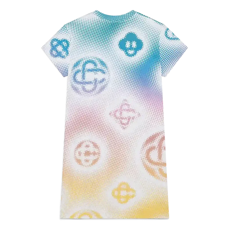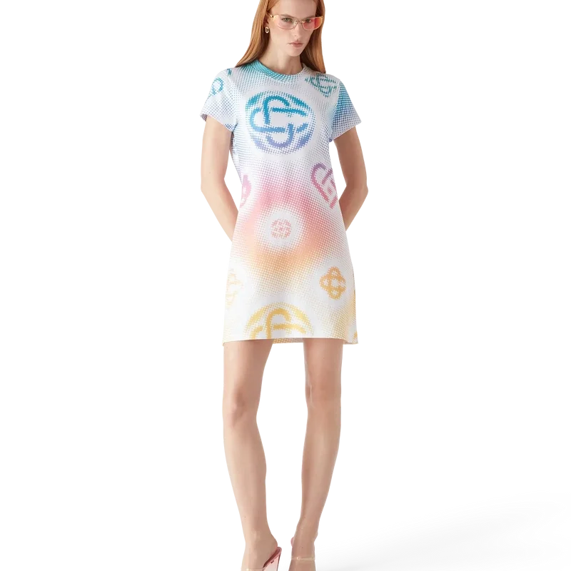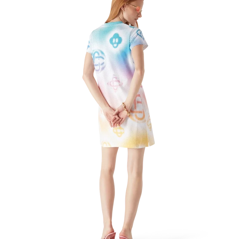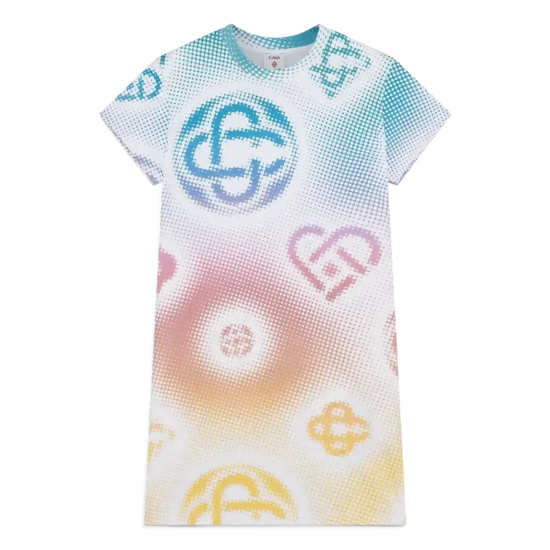 El vestido camiseta en semitonos es un diseño de manga corta confeccionado en tejido de algodón estampado con los monogramas de la casa realizados mediante aerografía, basándose en nuestros anteriores experimentos con esta técnica, y rematado con un clásico cuello redondo y una silueta holgada.