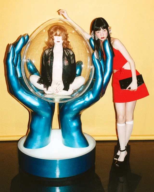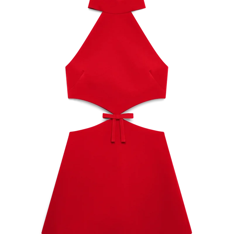 El vestido con aberturas es un diseño mini sin mangas y de corte en A con aberturas laterales. Se completa con cierre de cremallera, cuello halter con cuello de banda y detalle de lazo en la cintura, donde el tejido se estrecha.