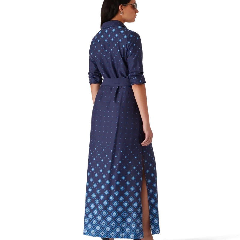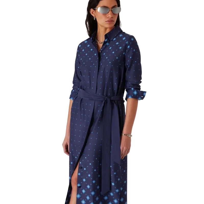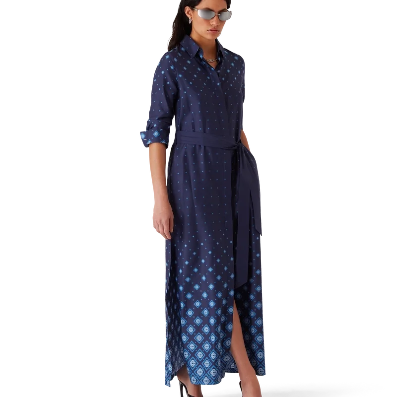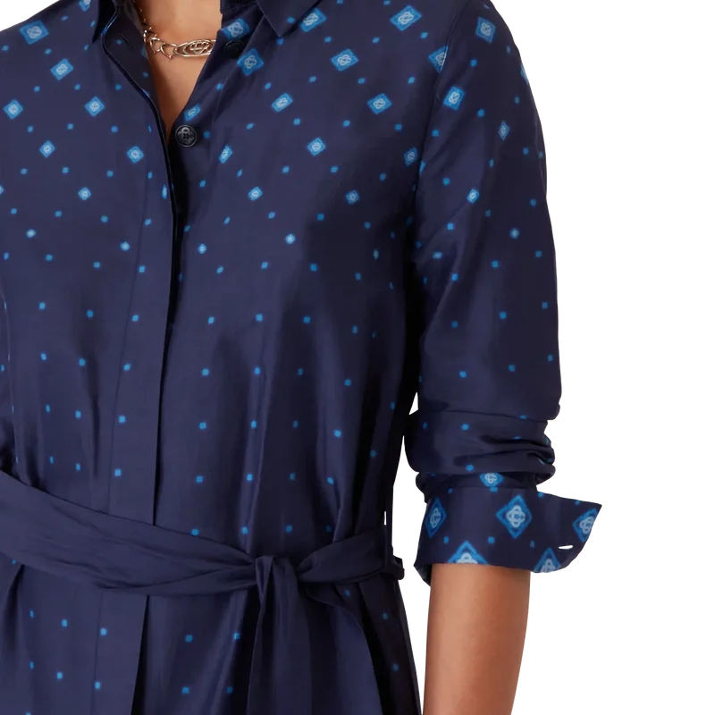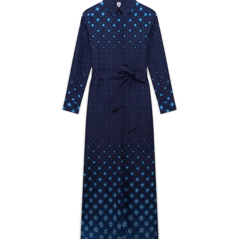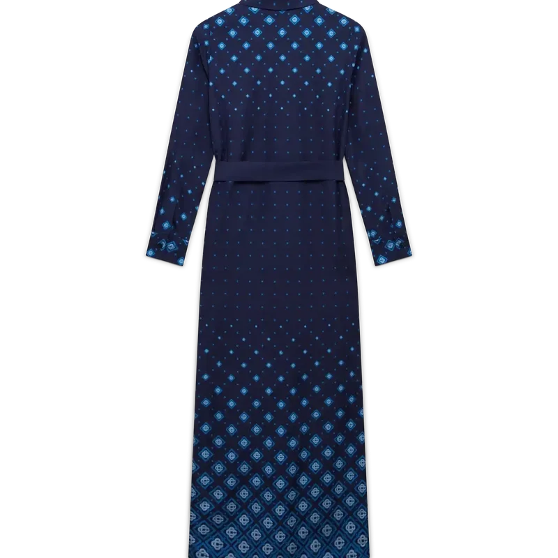 La camisa de seda degradada es un diseño clásico de manga larga y corte largo que presenta el estampado degradado Monogram característico de la casa, donde los degradados tonales se extienden a lo largo de la silueta. Se completa con cuello en punta, cierre con botones, botones de corozo con el logotipo CC entrelazado, presillas para cinturón, un cinturón textil a tono y botones esmaltados con ribete dorado en el cuello y los puños.